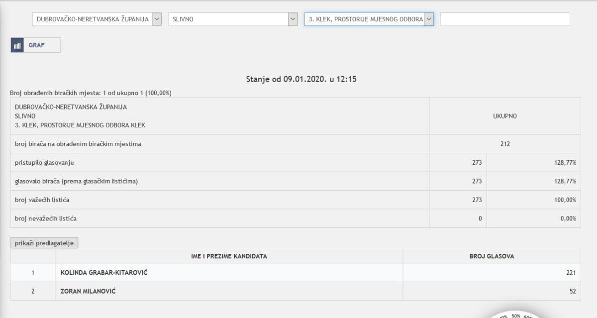 No, postoji biračko mjesto gdje je izlaznost bila i znatno veća od 100 posto. U mjestu Slivno u Dubrovačko-neretvanskoj županiji, na izbornom mjestu Klek, prema podacima DIP-a izlaznost je bila 128,77 posto. Na biračkom mjestu bilo je upisano 212 birača, a glasovalo je njih 273. Milanović je dobio 52, a Grabar-Kitarović 221.