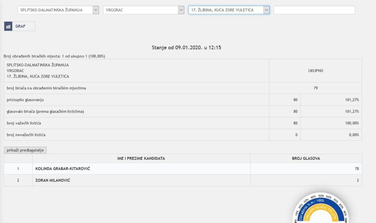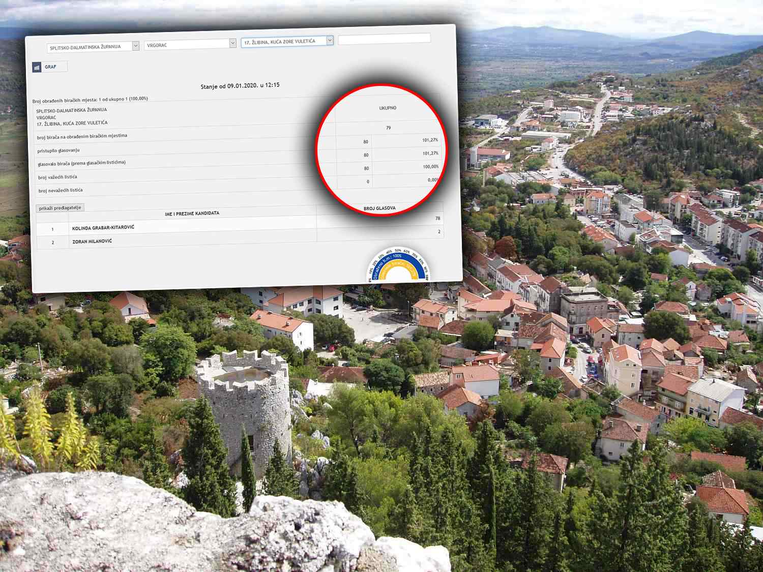 Primjerice, na biračkom mjestu Žlibine u Vrgorcu, u kući Zore Vuletića, DIP je izvijestio da je glasovanju pristupilo 101,27% birača. Na to biračko mjesto bilo je upisano 79 birača, a glasovanju je pristupilo njih 80. Grabar-Kitarović je dobila 78 glasova, Milanović 2.
