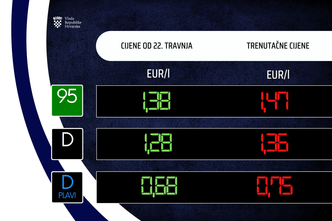 Danas je održana telefonska sjednica Vlade Republike Hrvatske na kojoj je donesena Uredba o utvrđivanju najviših maloprodajnih cijena naftnih derivata sukladno kojoj se najviše maloprodajne cijene računaju po formuli prema osnovnoj cijeni fosilnog goriva u prethodnom 14 dnevnom razdoblju, s ograničenom premijom od 0,1545 EUR/l za dizelsko i benzinsko gorivo, te 0,0781 EUR/l za plavi dizel, a u iznosu 0,8429 EUR/kg smjesa propan – butan za boce, odnosno 0,4116 EUR/kg za velike spremnike.