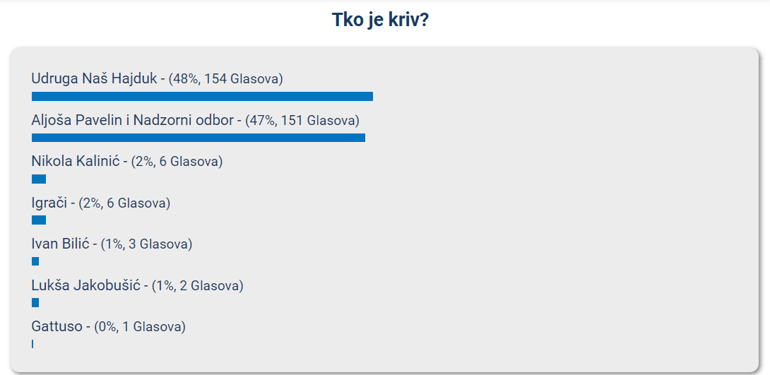 Najviše vas smatra da je najveći krivac za stanje u Hajduku Udruga Naš Hajduk i Nadzorni odbor na čelu s Aljošom Pavelinom. Čak 48% vas smatra da je Naš Hajduk najodgovorniji za loše stanje u klubu, a 47% vas smatra da je kriv NO i Pavelin.