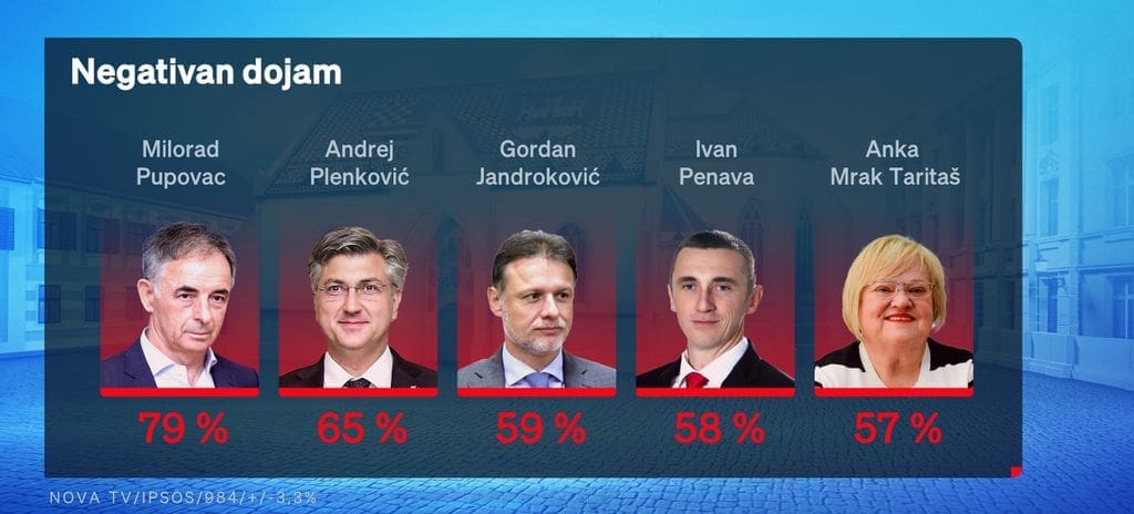 Na listi negativaca na prvom mjestu je Milorad Pupovac: 79 posto ispitanih smatra ga negativcem. Drugi je Andrej Plenković, na kojega loše reagira 65 posto ispitanih. Za njim slijede Gordan Jandroković i Ivan Penava, i tu se možda i najbolje vidi kroz koga se na političkoj sceni doživljava negativnost koju ljudi osjećaju ovih dana. Peta je na ovoj listi Anka Mrak Taritaš.