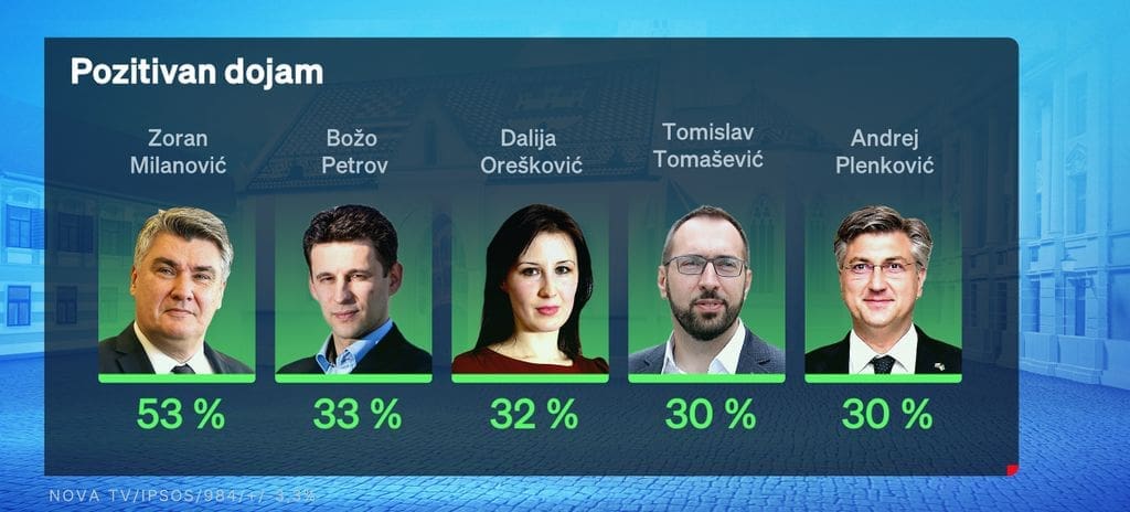 Na drugom je mjestu Božo Petrov, koji je također pozitivac, ali za 33 posto ispitanih. Daliju Orešković pozitivnom doživljava 32 posto ispitanih, Tomislav Tomašević i Andrej Plenković dijele četvrtu poziciju - pozitivci su za 30 posto ispitanih.