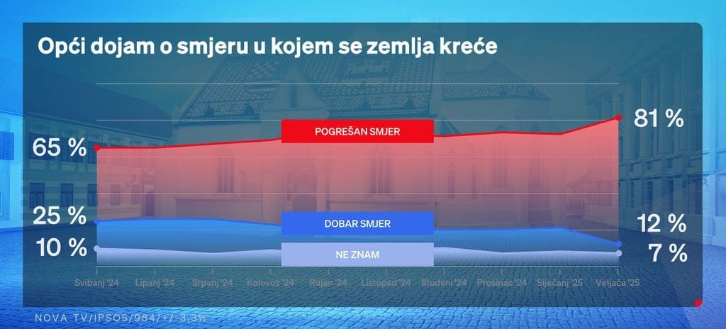 To je pitanje koje redovno postavljamo ispitanicama i ispitanicima, i ovaj mjesec više od 80 posto ispitanih - točnije, 81 posto - vjeruje da država naprosto ide u krivom smjeru. U odnosu na prošli mjesec to je jako velik skok, za čak devet postotnih bodova.