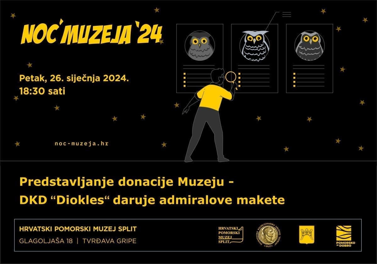 U sklopu ovogodišnje Noći muzeja, kojoj je središnja tema "Muzeji i nova publika" Hrvatski pomorski muzej Split i Dalmatinsko kolekcionarsko društvo "Diokles" iz Splita organiziraju predstavljanje donacije maketa brodova iz zbirke admirala Benka Matulića, u petak 26. siječnja 2024. u 18:30 u Hrvatskom pomorskom muzeju, Glagoljaška 18 na Gripama.