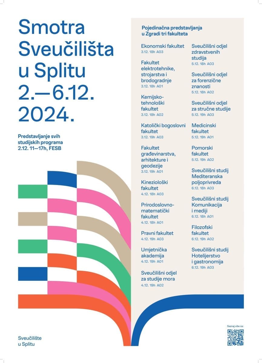 Smotra Sveučilišta u Splitu ove će se godine ponovno odvijati pet dana i to na dvije lokacije u vremenu od 2. do 6. prosinca. Prvog dana u prostoru aule Fakulteta elektrotehnike, strojarstva i brodogradnje na štandovima će se predstaviti sve sastavnice, a ostale dane u Zgradi tri fakulteta održat će se pojedinačna predstavljanja studijskih programa.