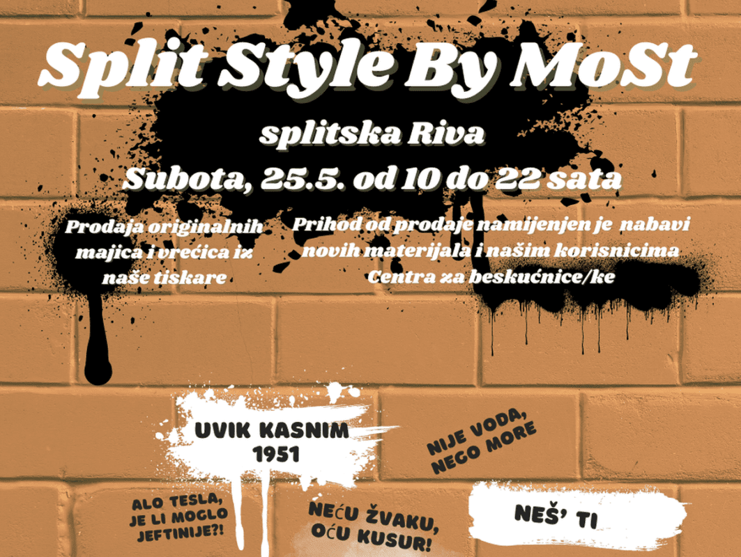 "Naši prodavači, korisnici i volonteri, na nekoliko štandova nudit će veliki izbor šaljivih splitskih poruka i grafita otisnutih na majice i platnene vrećice", poručuju iz Udruge MoSt.