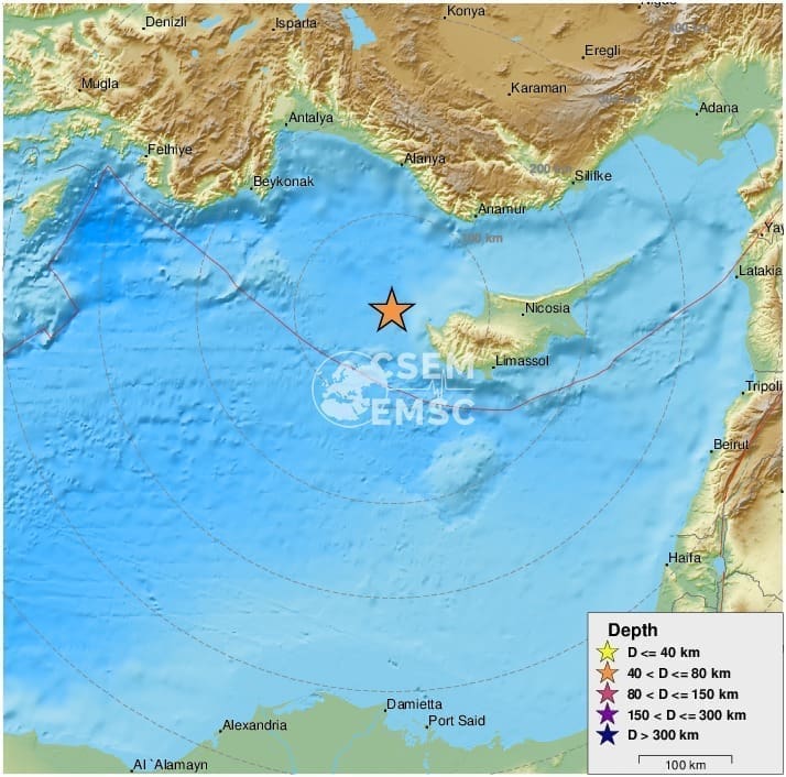 Prema informacijama stranice EMSC, epicentar potresa bio je u Sredozemnom moru, 57 kilometara zapadno sjeverozapadno od grada Pegeia i 119 kilometara zapadno sjeverozapadno od Limassola.