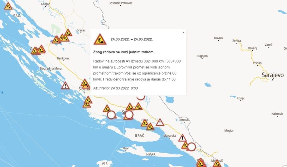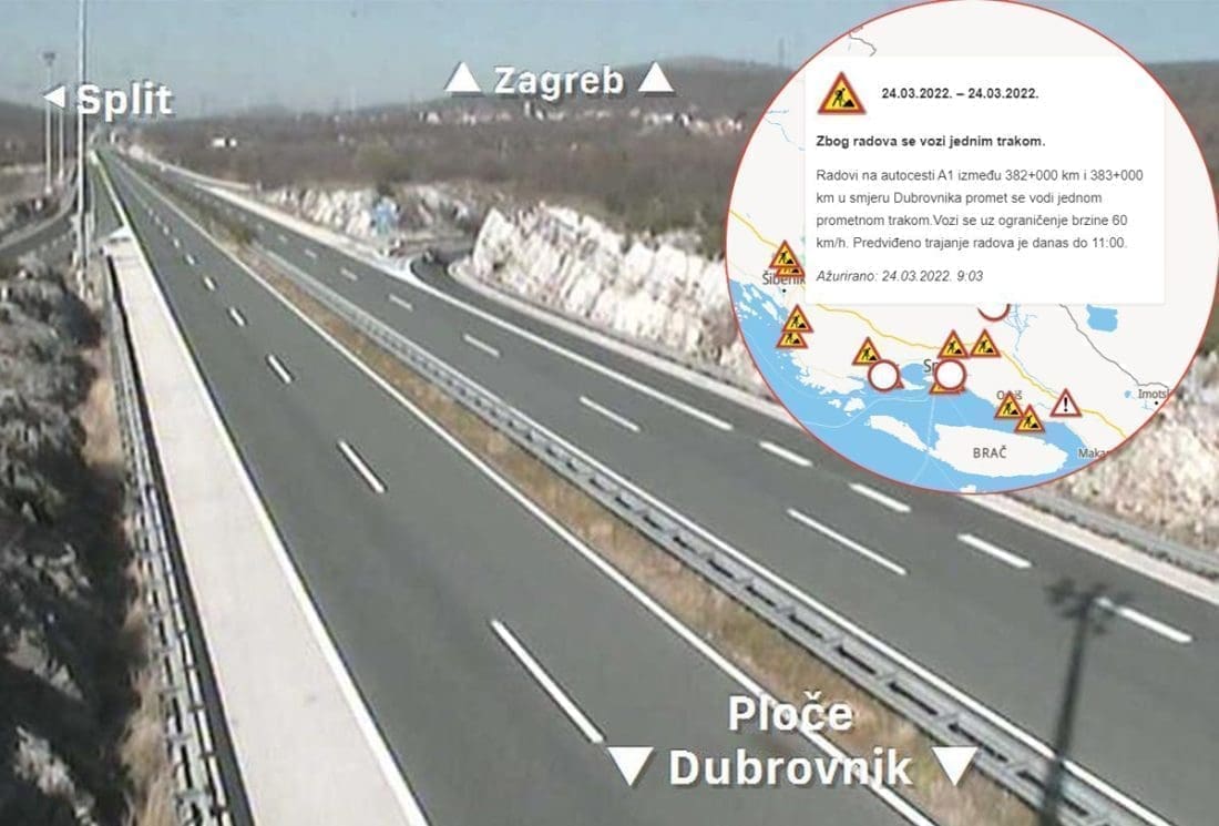 "Radovi na autocesti A1 između 382+000 km i 383+000 km u smjeru Dubrovnika promet se vodi jednom prometnom trakom.