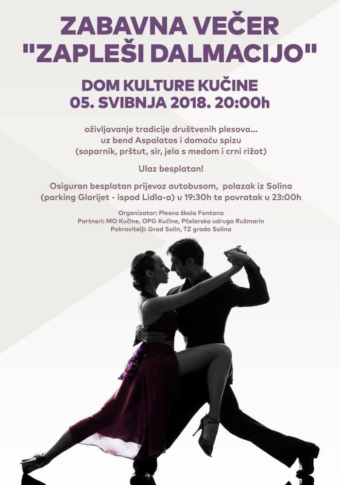 U organizaciji Plesne škole Fontana u suradnji s MO Kučine i OPG Kučine te Pčelarskom udrugom Ružmarin a pod pokroviteljstvom grada Solina i Turističke zajednice grada Solina , zadovoljstvo nam je najaviti ovu subotu 05.svibnja s početkom u 20:00h u Domu kulture u Kučinama zabavnu večer „Zapleši Dalmacijo“.