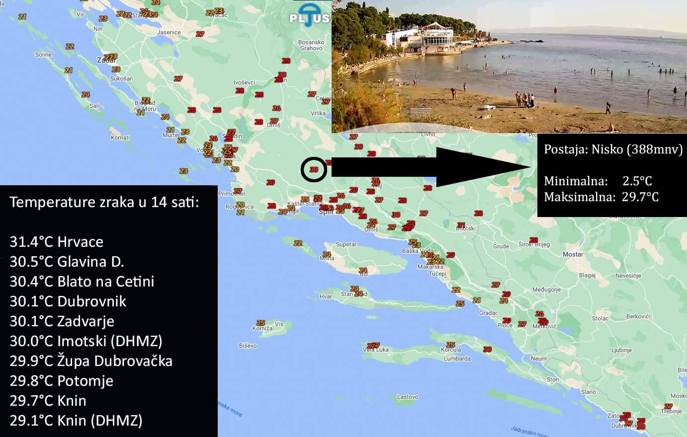 Nadalje, zanimljive temperature su bile u mjestu Nisko u kliškom zaleđu. Jutros je minimalnu temperatura bila 2.5 stupnja, dok je izmjerena maksimalna bila vrlo visokih 29.7 stupnjeva Celzijusa.
