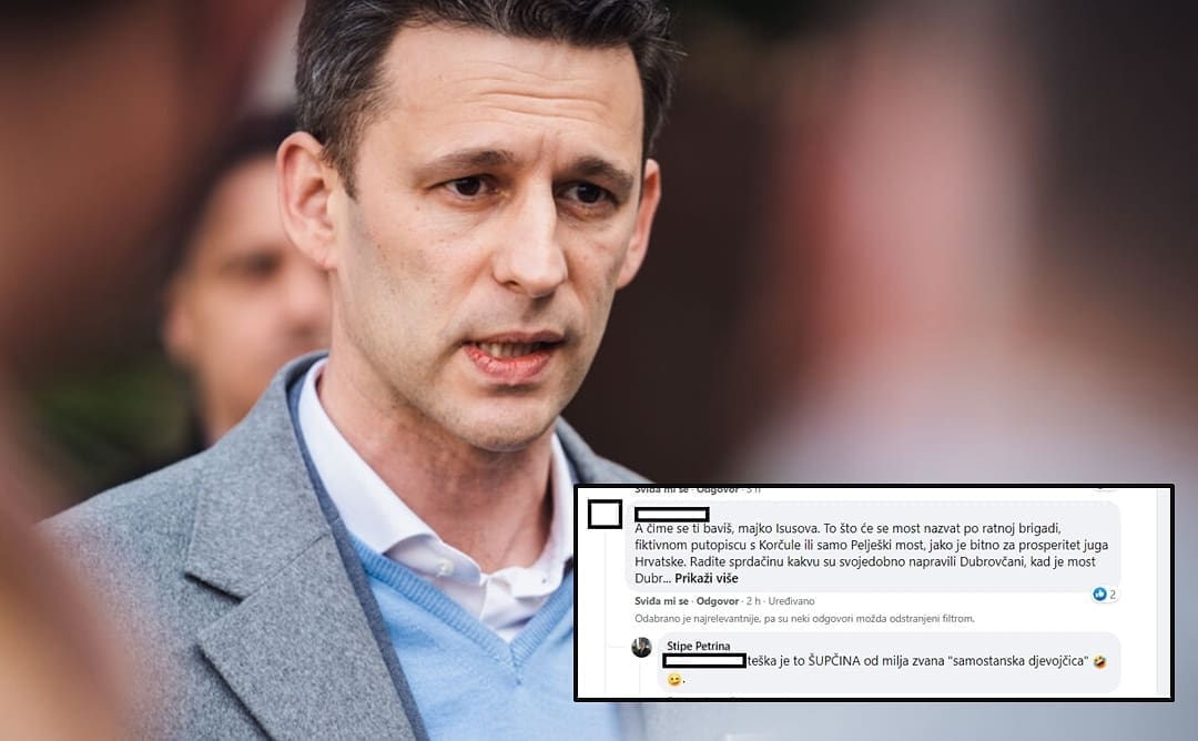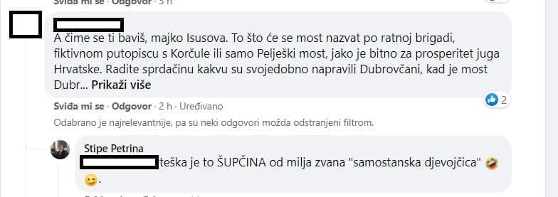 "Teška je to *upčina od milja zvana "samostanska djevojčica", komentirao je Petrina komentar jednog od Facebook korisnika koji je također kritizirao lidera Mosta Božu Petrova.