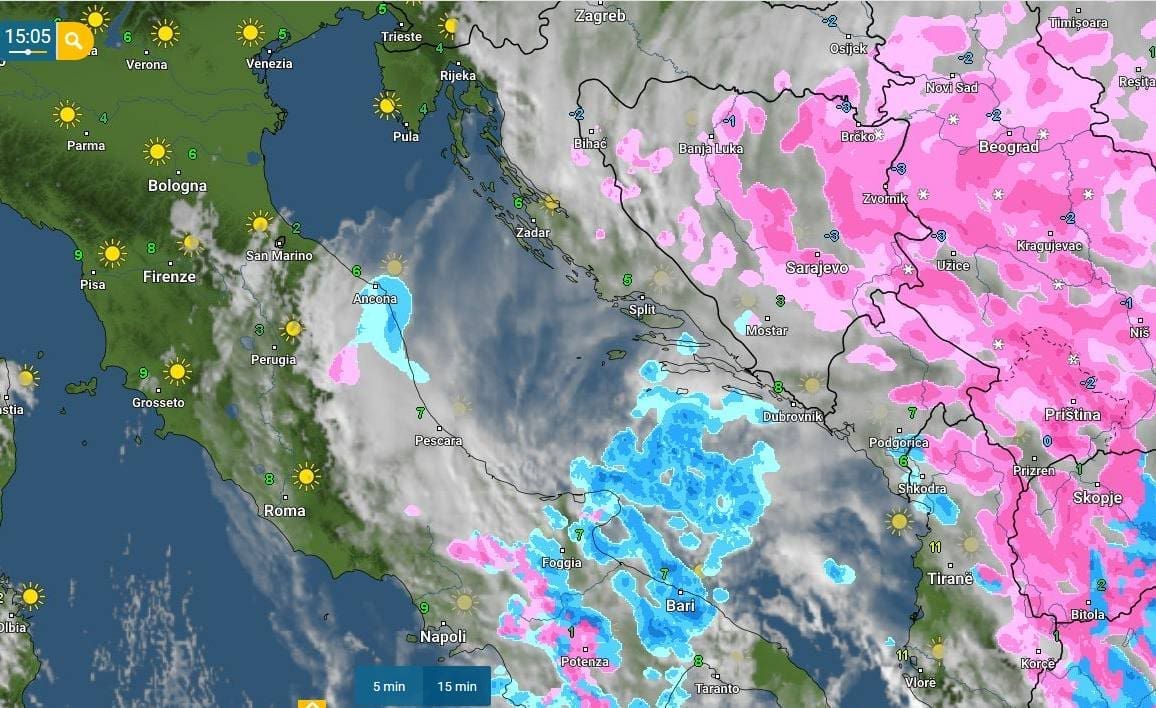 Pogled na aktualnu satelitsku snimku otkriva da je cijeli sjeverni Jadran u području vedrine, a u Dalmaciji ima sve više oblaka prema jugu. To ne čudi jer se duboki ciklonalni centar nalazi nad Jonskim morem pa dio vlage, usprkos buri, uspijeva stići do južne i dijela srednje Dalmacije.