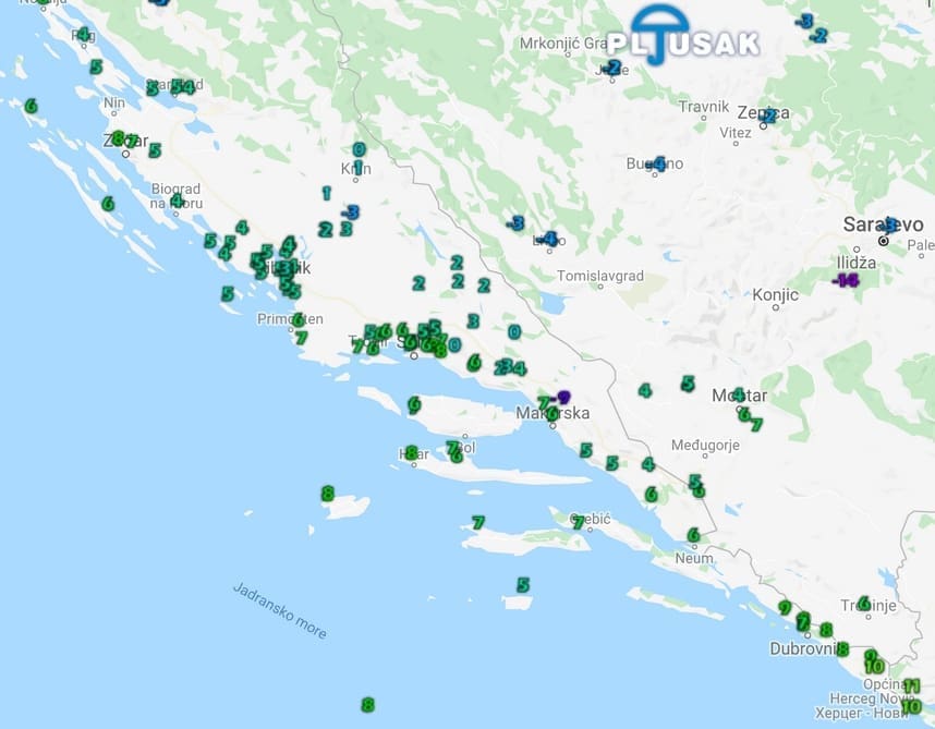 S jačanjem naoblake s juga, u dijelu srednje i južne Dalmacije ponegdje ima slabih oborina. Tako je slab snijeg zabilježen na vrgoračkom području, u dolini Neretve, na Pelješcu, a počeo je padati i na dijelu Makarske rivijere, osobito u Baškoj Vodi i Brelima. Slab snijeg iza 15 sati počeo je padati u mosorskim naseljima Dubrava, Gornje i Donje Sitno, ali i u Žrnovnici.