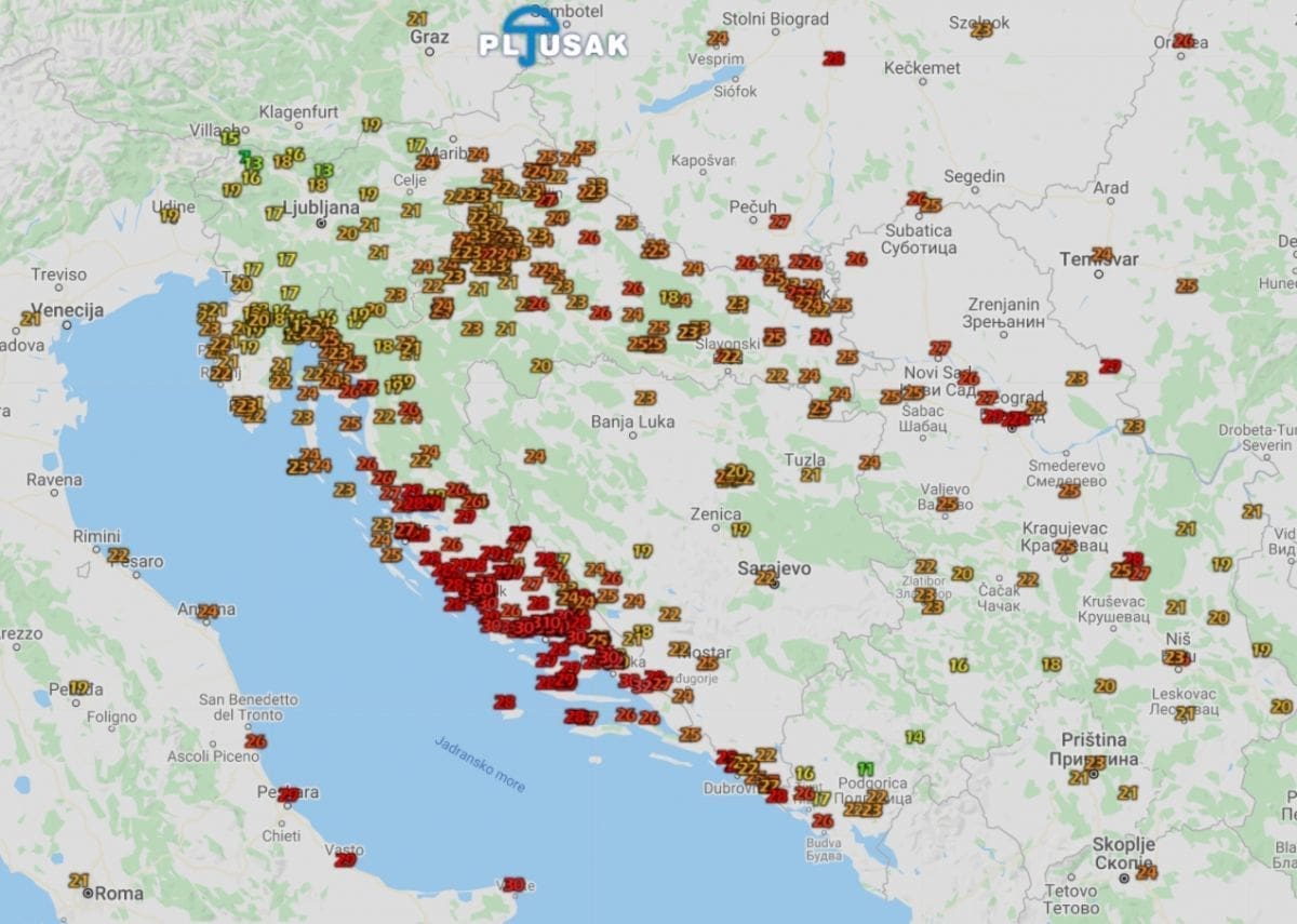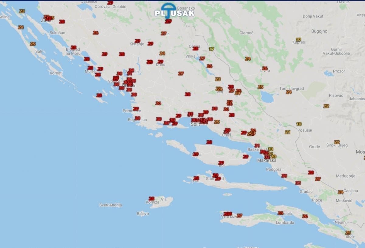 Baška Voda, Bilice, Stobreč, Kaštel Gomilica i Kamen (Split) mjere 31°C, a 30°C imaju ostatak Splita, Šibenik, Starigrad Paklenica, Trogir, pa čak i Dugopolje u Zagori.