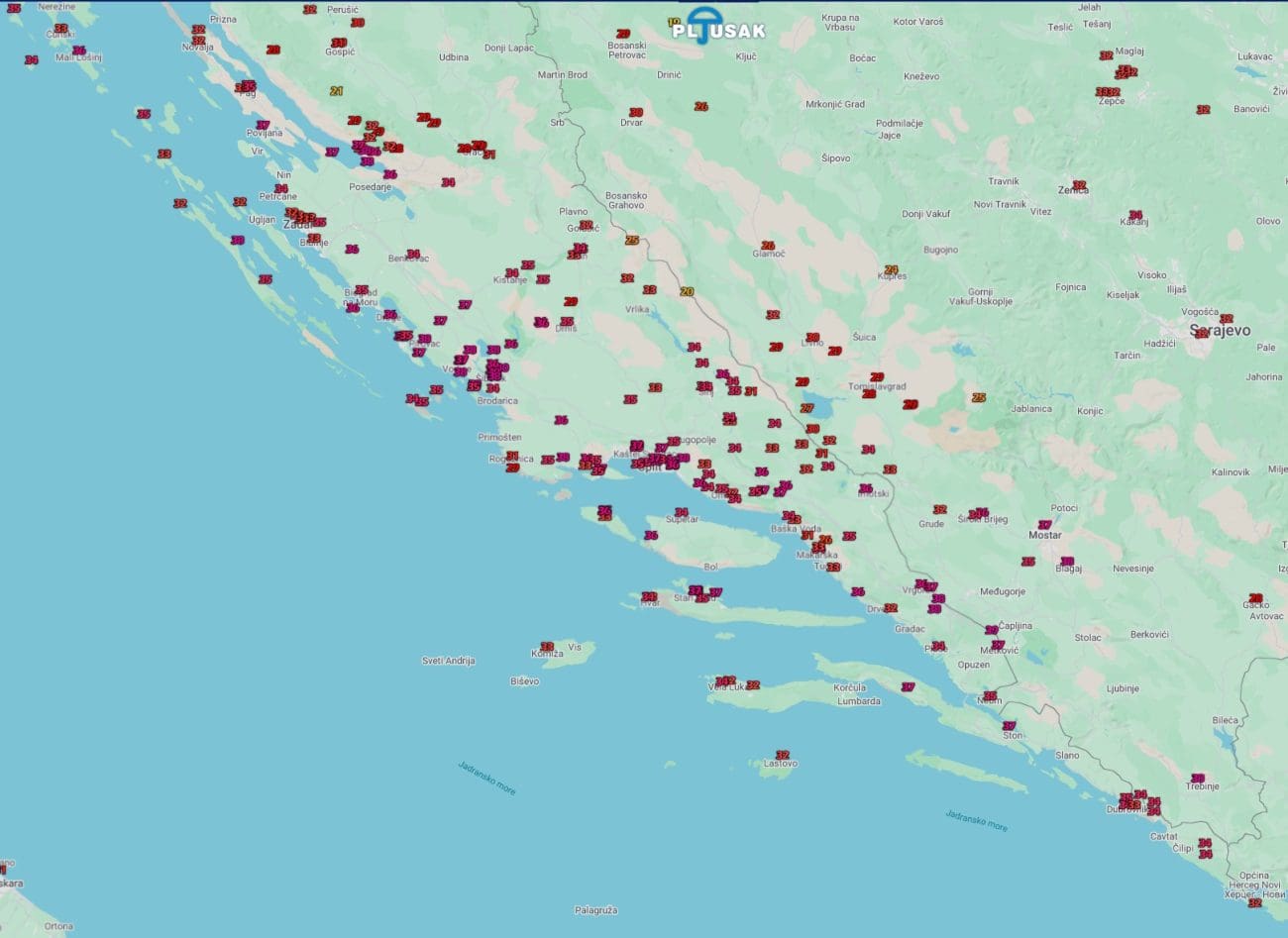 Brela u ponoć mjere čak 32°C, a slijede Dugi Rat 31,9°C, Dubrovnik 31,9°C, Krvavica 31,8°C, Kaštel Gomilica 31,3°C, Omiš 31,2°C, Komiža 31,1°C, Hvar 30,9°C, Split Kamen 30,6°C, Ston 30,5°C, Supetar 30,4°C, Čiovo 30.4°C, Pirovac i Trogir 30,3°C, Solin i Milna 30,1°C itd.