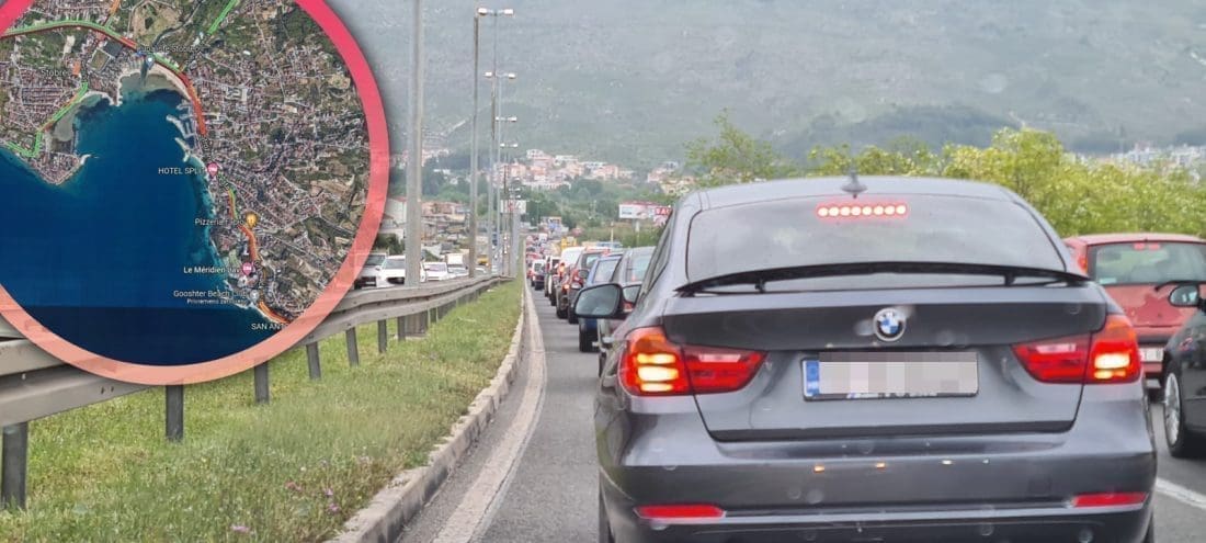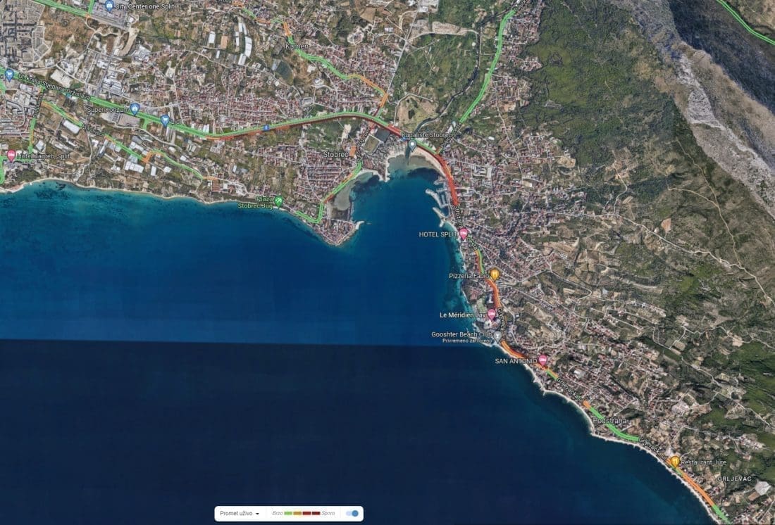 Znatno veće gužve su na izlazu iz Splita u smjeru Podstrane. Kolona počinje otprilike od nadvožnjaka na Sirobuji.