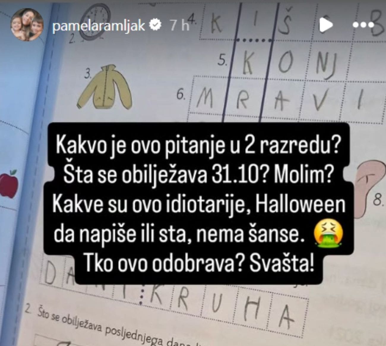 Pamela je uz fotografiju podijelila svoju zgroženost: "Kakvo je ovo pitanje u drugom razredu? Što se obilježava 31.10.? Molim? Kakve su ovo idiotarije, Halloween da napiše ili što, nema šanse. 🤮 Tko ovo odobrava? Svašta!" Njezin je sin na pitanje odgovorio: "Zadnji dan je 31.10."