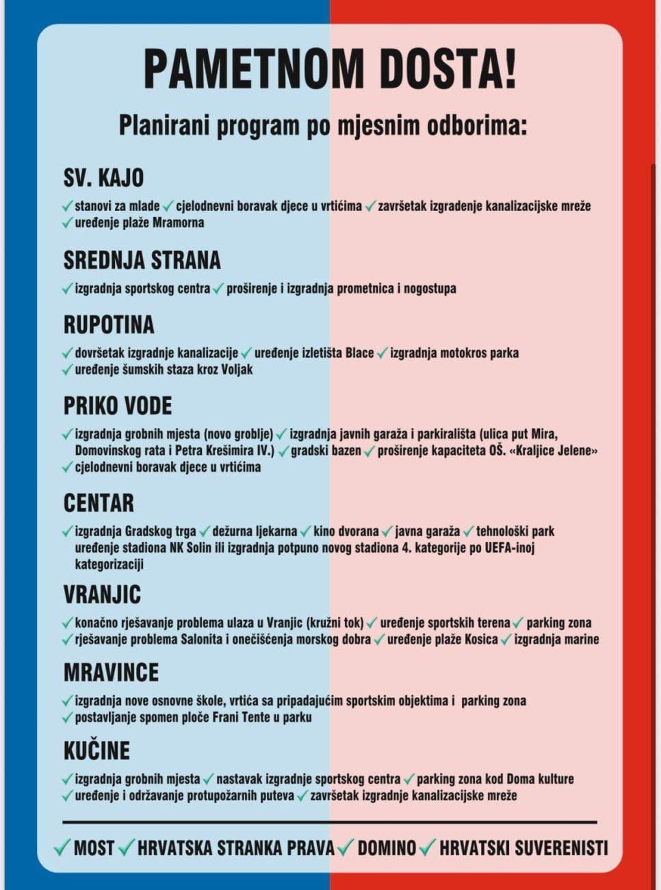 E – gradonačelnik, javne garaže, stanovi za mlade, vrtići- cjelodnevni boravak, dežurna ljekarna, najmanja porezna stopa, uređenje plaža, biciklističke staze, šetnice, grobnice, uređenje Salone, izgradnja muzeja, trg, marina, kino, gradski bazen, sport (svi su bitni ), sufinanciranje gradskih vrtića, tehnološki park, povećanje naknade za novorođenčad.