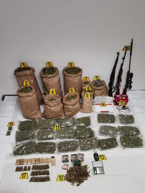 Tijekom kriminalističkog istraživanja obavljena je pretraga doma i drugih prostorija koje navedeni koristi na području Jelse na Hvaru. Tom prilikom je pronađeno i oduzeto 23.274 grama droge marihuane kao i dvije puške od kojih jedna s optikom, poluautomatska puška i 701 komad raznog streljiva.