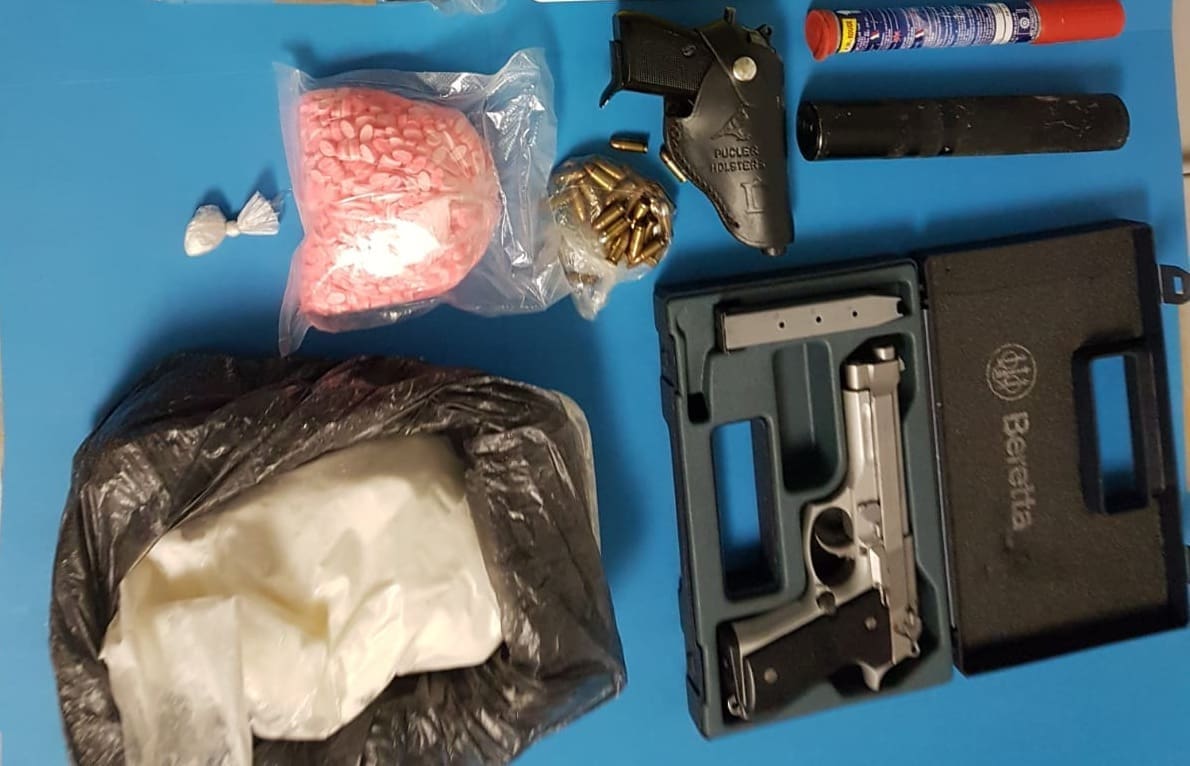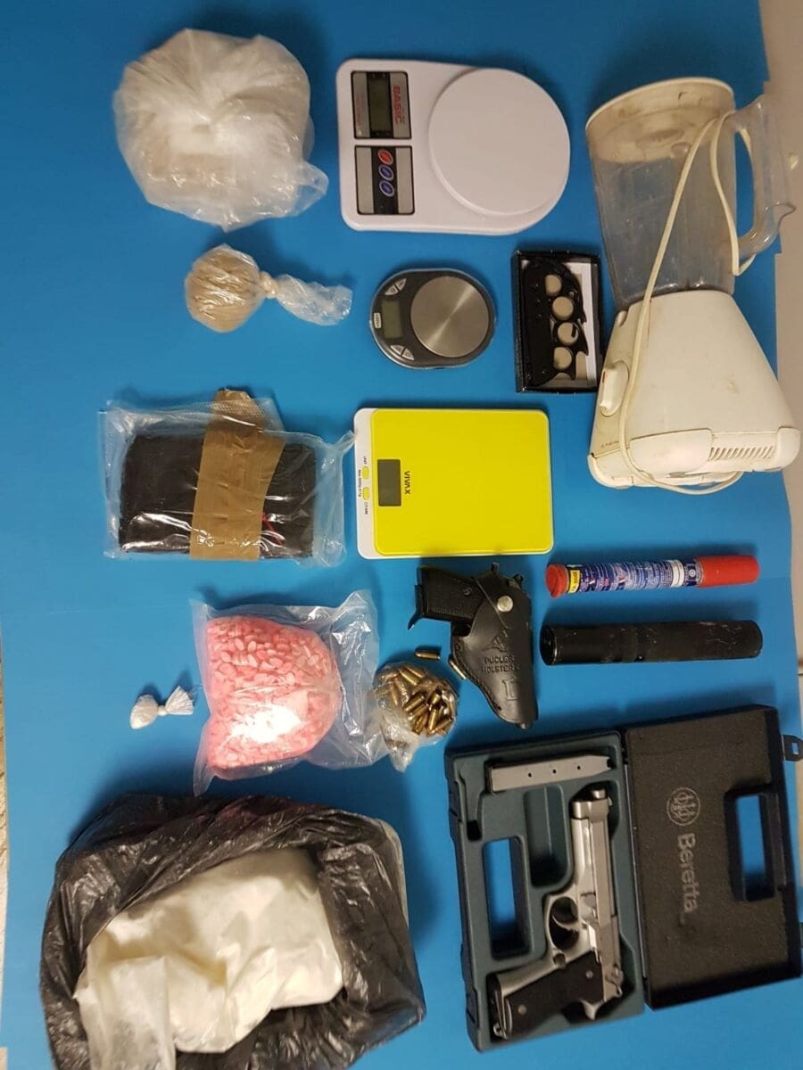 U sklopu kriminalističkog istraživanja jučer je obavljena pretraga iznajmljenog prostora u stambenom podrumu zgrade u Splitu kojeg koristi osumnjičenik. Tijekom pretresa je pronađeno 502 grama kokaina, 643,4g heroina, 1000 tableta ecstasyja težine 405g, 1680g amfetamina speeda, dva pištolja sa tri spremnika, jedan prigušivač za pištolj, 41 komad streljiva call 7,65, tri digitalne vage te pribor i oprema za pakiranje droge.