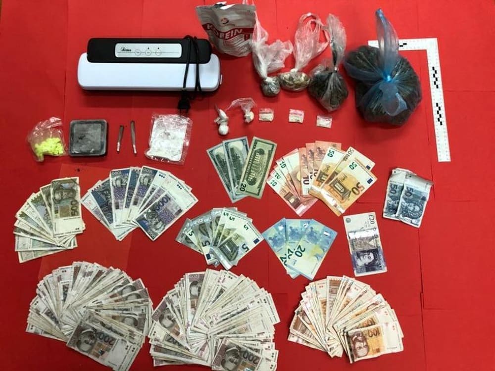 Naime, u sklopu kriminalističkog istraživanja kod njega je pronađeno i oduzeto 337 grama marihuane, 25 grama halucinogene gljive psilocibin, 22,9 grama amfetamina, 3,6 grama droge MDMA, 62 tablete ecstasy, digitalna vaga za precizno mjerenje, aparat za vakumiranje, sumnjiva praškasta materija bijele boje nepoznatog kemijskog sastava te veći novčani iznos u raznim valutama.