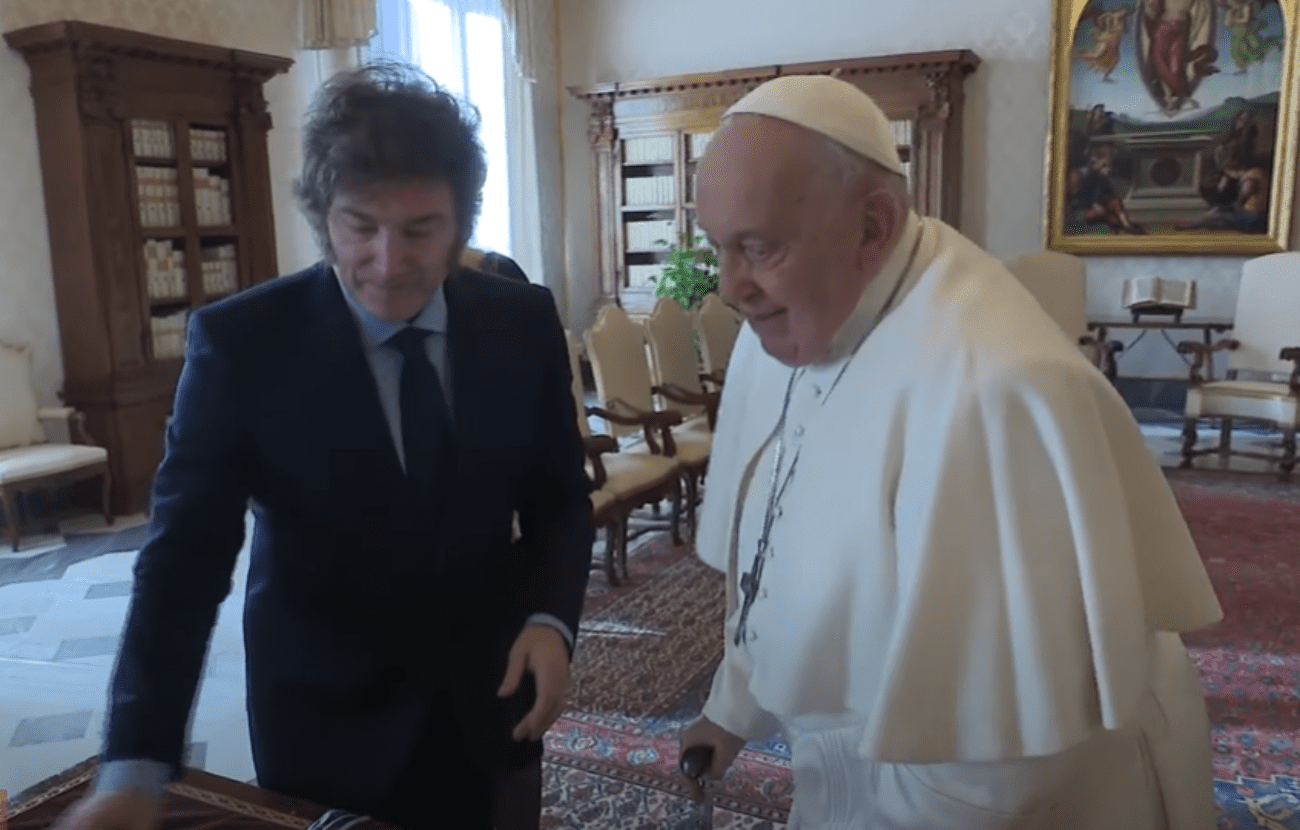 Milei se u više navrata sukobljavao s Papom. Prije nego što je preuzeo dužnost, kritizirao je Papu zbog njegovih stavova o gospodarskoj politici, čak ga je 2022. godine optužio da je "uvijek na strani zla". Tijekom predsjedničke kampanje 2023. nazivao je Papu "imbecilom" koji brani socijalnu pravdu, uspoređujući ga sa zlom i vragom.