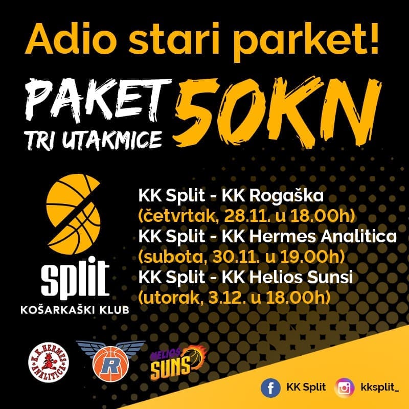 Kreće serija od tri domaće utakmice Splita, u četvrtak u 18 sati na Gripe u sklopu 9. kola Druge ABA lige stiže Rogaška, u subotu Hermes Analitica, a u utorak gosti "Žutih" su Helios Sunsi.