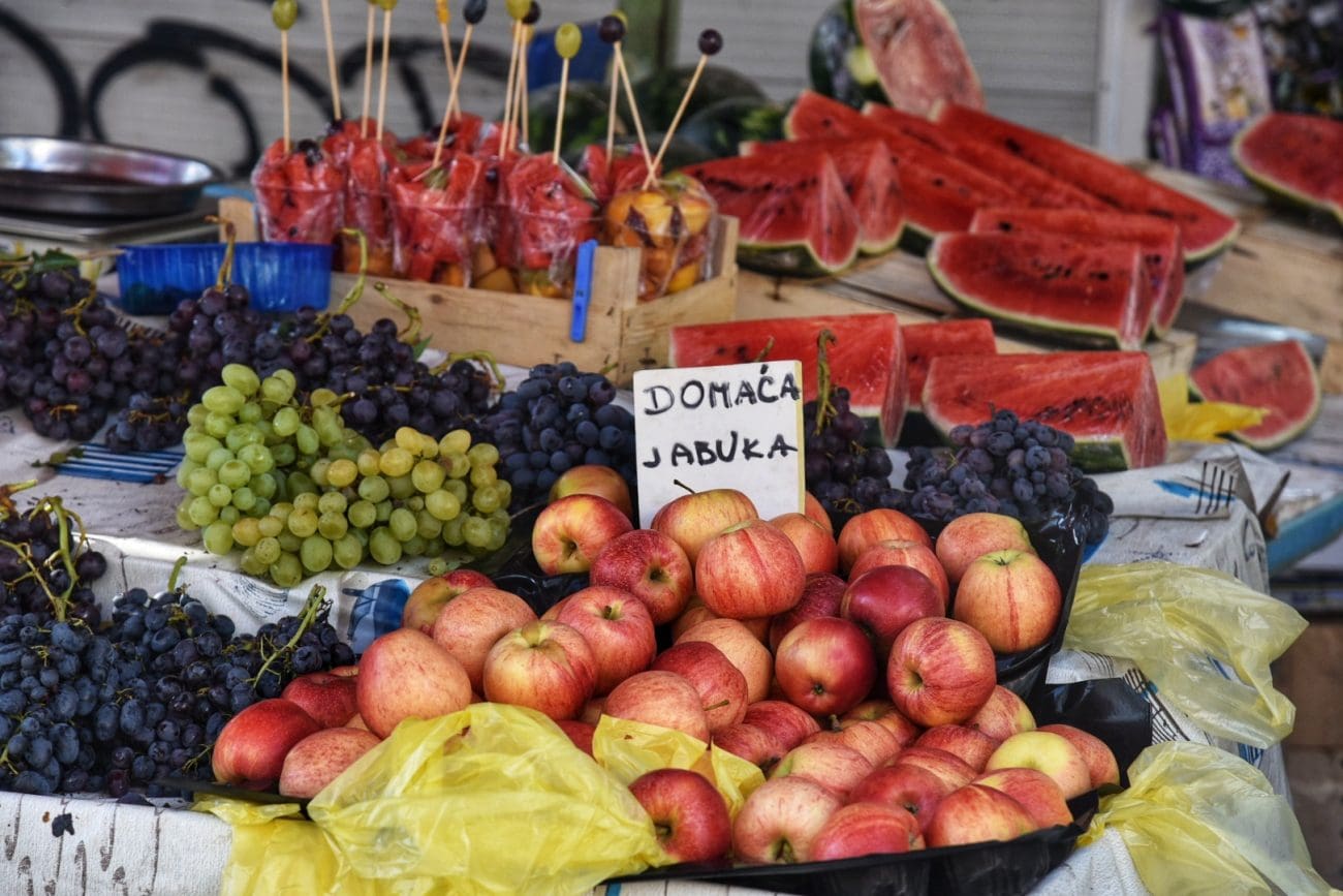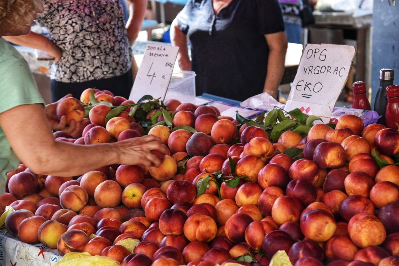 Pazar nudi i bogatu ponudu voća pa ćete za kilogram domaćih breskvi izdvojiti 4 eura dok se iste mogu naći i za 3 eura. Grožđe je 3 eura, smokve 2, šljive 2.50, jabuke domaće 3 eura, a kruške 2 eura za kilogram.