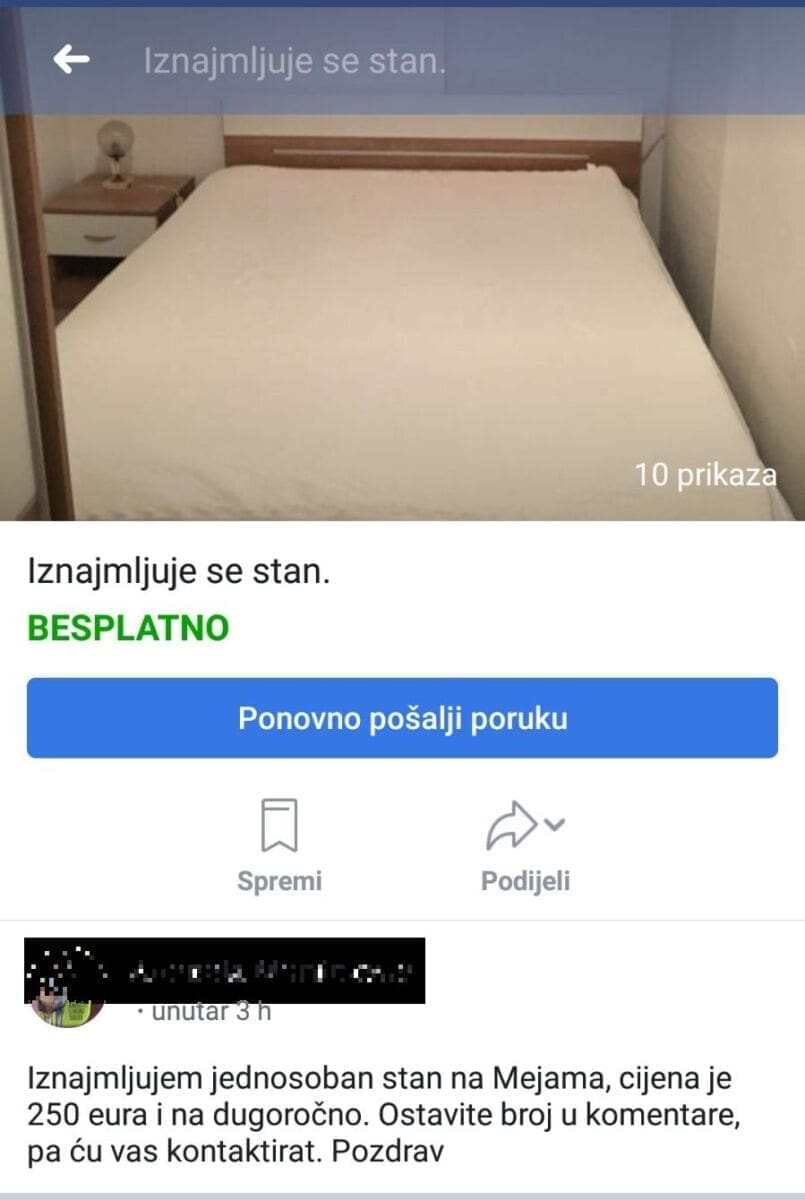 - S obzirom na to da se radi o imovinsko-pravnom odnosu, gospodina smo uputili da stvar riješi pred nadležnim institucijama, tj. na sudu u građanskoj parnici. S obzirom na prijevaru gdje je ženska osoba dala stan, koji nije u njenom vlasništvu, u najam provodimo kriminalističko istraživanje. Za sada smo zaprimili 3 kaznene prijave u odnosu na navedenu od oštećenih.- kazali su nam iz policije.