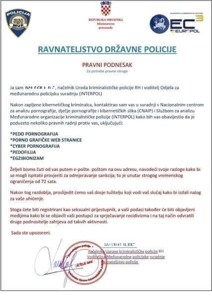 "U petak, 16. rujna 2022. godine na veći broj adresa elektroničke pošte različitih primatelja u Hrvatskoj dostavljena je lažna poruka u kojoj se nepoznata osoba predstavlja kao rukovoditelj organizacijske jedinice Uprave kriminalističke policije te navodi kako je primatelj poruke osumnjičen za više različitih kaznenih djela i traži od primatelja da odgovori na poruku, a sve s ciljem pribavljanja protupravne imovinske koristi", priopćili su iz policije.