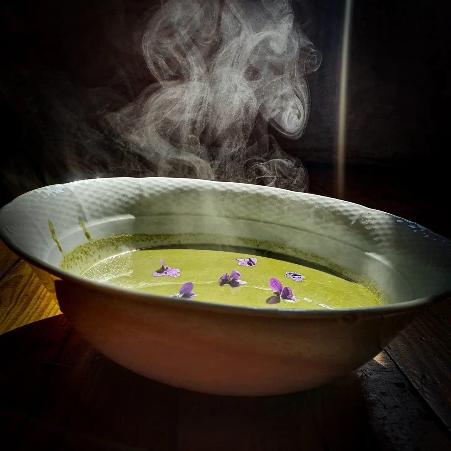 Krumpire napola skuhati, zatim dodati grzdulju, poriluk, ljukelj i koromač. Posoliti i kuhati dok se krumpiri ne raskuhaju. Sve usitniti štapnim mikserom, dodati maslinovo ulje i svježe mljeveni šareni papar. Na kraju ukrasiti cvjetovima ljubičice. (Napomena: umjesto grzdulje može se koristiti i drugo samoniklo jestivo bilje.) -