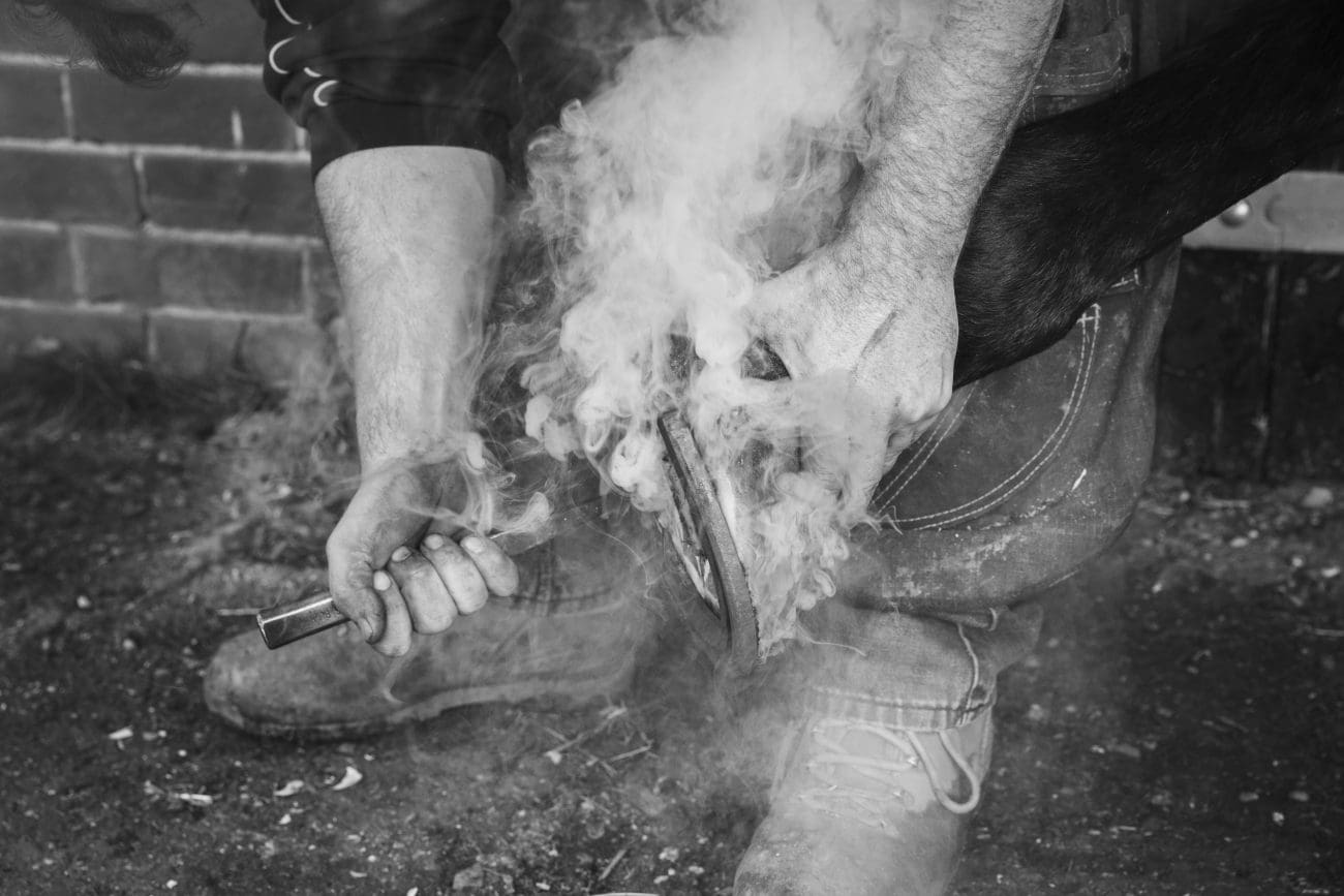 — Drži ga sad da se ne miče — izusti Anđelko pa užarenu potkovu prisloni na konjevo kopito i jako stisne. Stvori se gust bijeli dim, a mali Ante odmah zakašlja. Miris spaljene rožine i dima iz ognjišta ispunio je radnju. Ante je gledao stvaranje otiska potkove na kopitu, odnosno ležišta u koje će nova potkova savršeno pristajati. Prije pričvršćivanja, obrusio je spaljeni dio rožine.