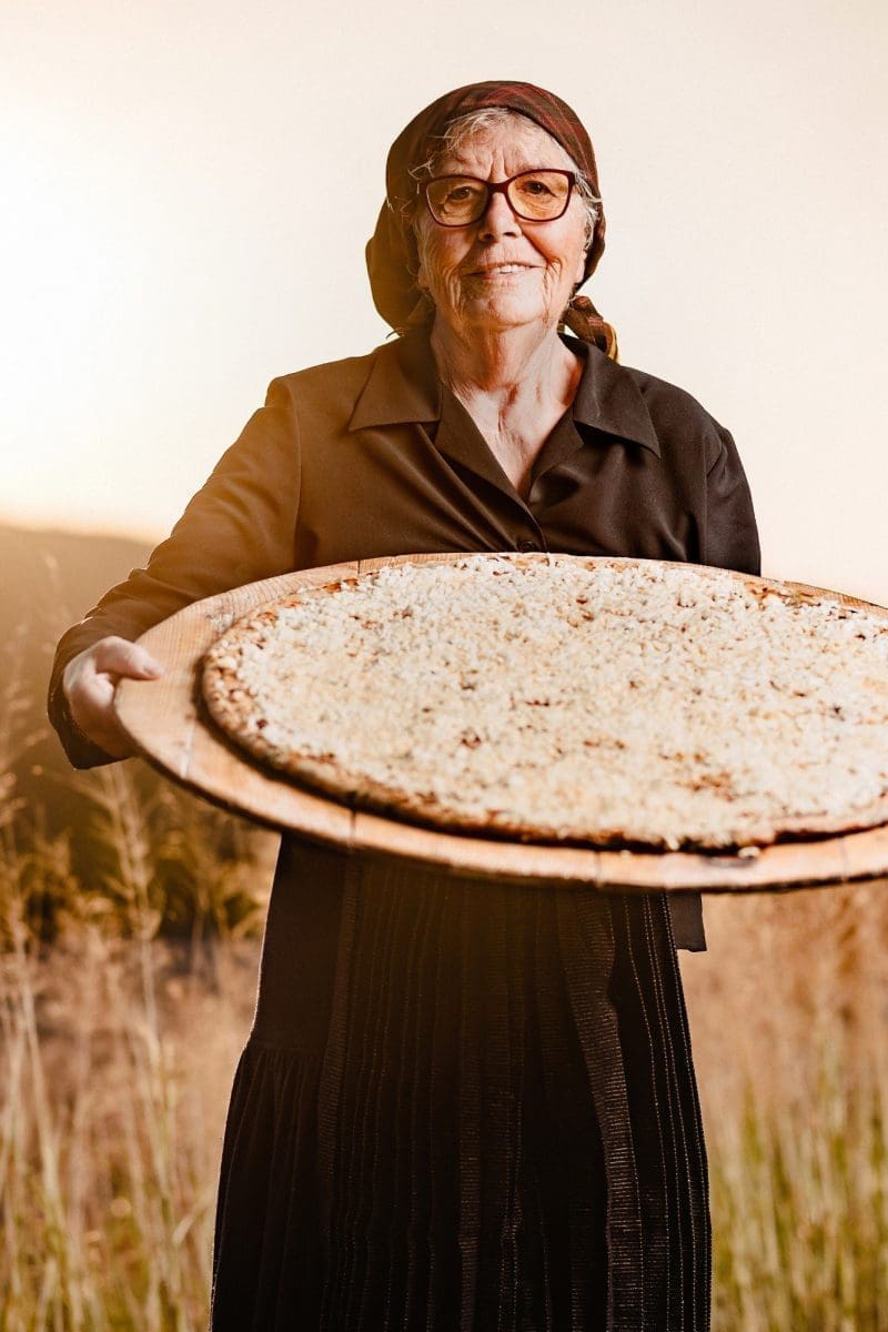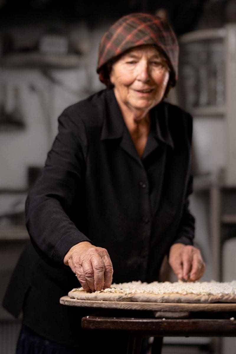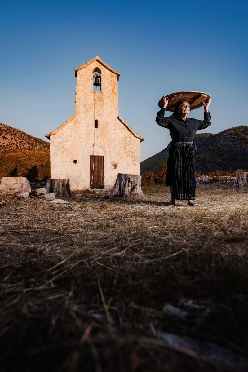 Divnoga li trenutka kada je naša Pavenka smogla još snage, podigla plisnac sa sinijom na glavu i prošetala do crkvice Sv. Mihovila na Gračiću, najstarijeg očuvanog objekta u Žrnovnici. Na samom kraju dana zrake zalazećeg sunca obasjale su povijesnu crkvicu na Gračiću i našu vrijednu 74-godišnjakinju. Držala je nimalo laganu siniju na glavi ponosno, baš kao što je to na istom mjestu prije više od šest desetljeća činila njena majka. Nakon toga je prislonila siniju na panj, razrezala svojih ruku djelo te nam ponudila komad.