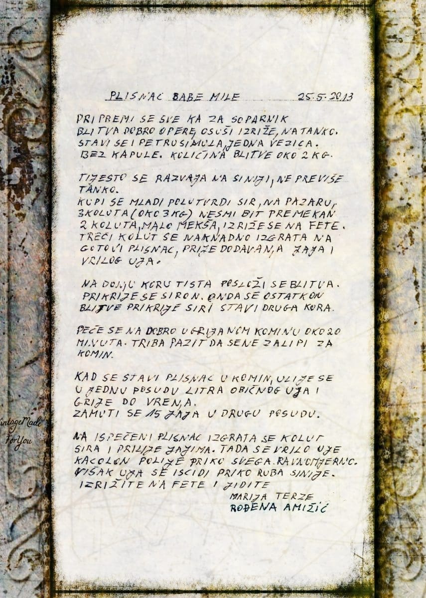 Samo za ovu prigodu naša domaćica odjenula je robu koju je nekada nosila njena majka Kristina. Na siniji po sredini komina nalazili su se sastojci za plisnac.