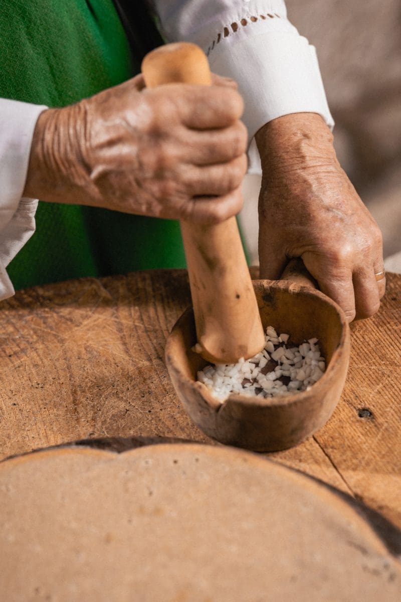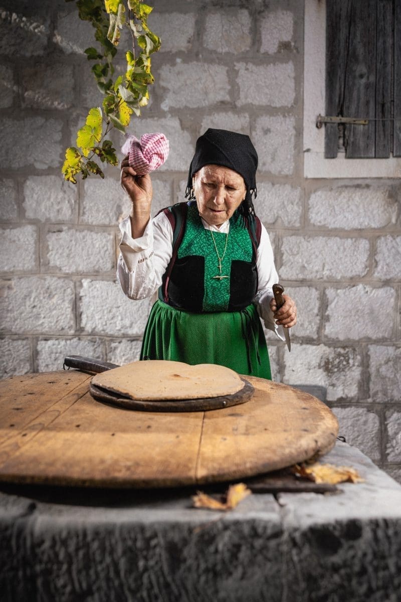 Peče se od 20 do 25 minuta, nakon čega se omete metlicom, otrese te se stavi na lopar. Tituš se nabocka nožem da bolje upije kad se začini maslinovim uljem i lukom. Isicka se luk, mada se zapravo tuče u drvenoj zdilici koja se zove lukotuč. Dok se zeljenik riže na rombove, tituš se nožem riže na kocke - kazala nam je ponosno, a svaka njena riječ i pokret odisali su velikim iskustvom i ljubavlju prema tradiciji i njenim Poljicima.