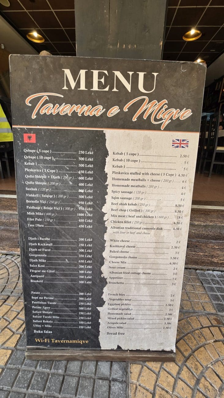 Cijene su ovdje izuzetno povoljne u usporedbi s onima u Dalmaciji. Kebab se nudi već za 2,5 €, dok je veća porcija 5 €. Pileći filet ili tradicionalna albanska tava stoje 4,5 €, a pljeskavica punjena sirom 6 €. Najskuplje jelo na meniju je miješano meso od 600 grama, koje košta 18 €, dok goveđi odrezak ili ražnjići stoje 9,5 €. Predjela poput bijelog sira ili prženog sira stoje samo 2 €, dok se salate i prilozi kreću od 2 do 3,5 €. Kruh je besplatan, što dodatno naglašava pristupačnost ovog restorana.