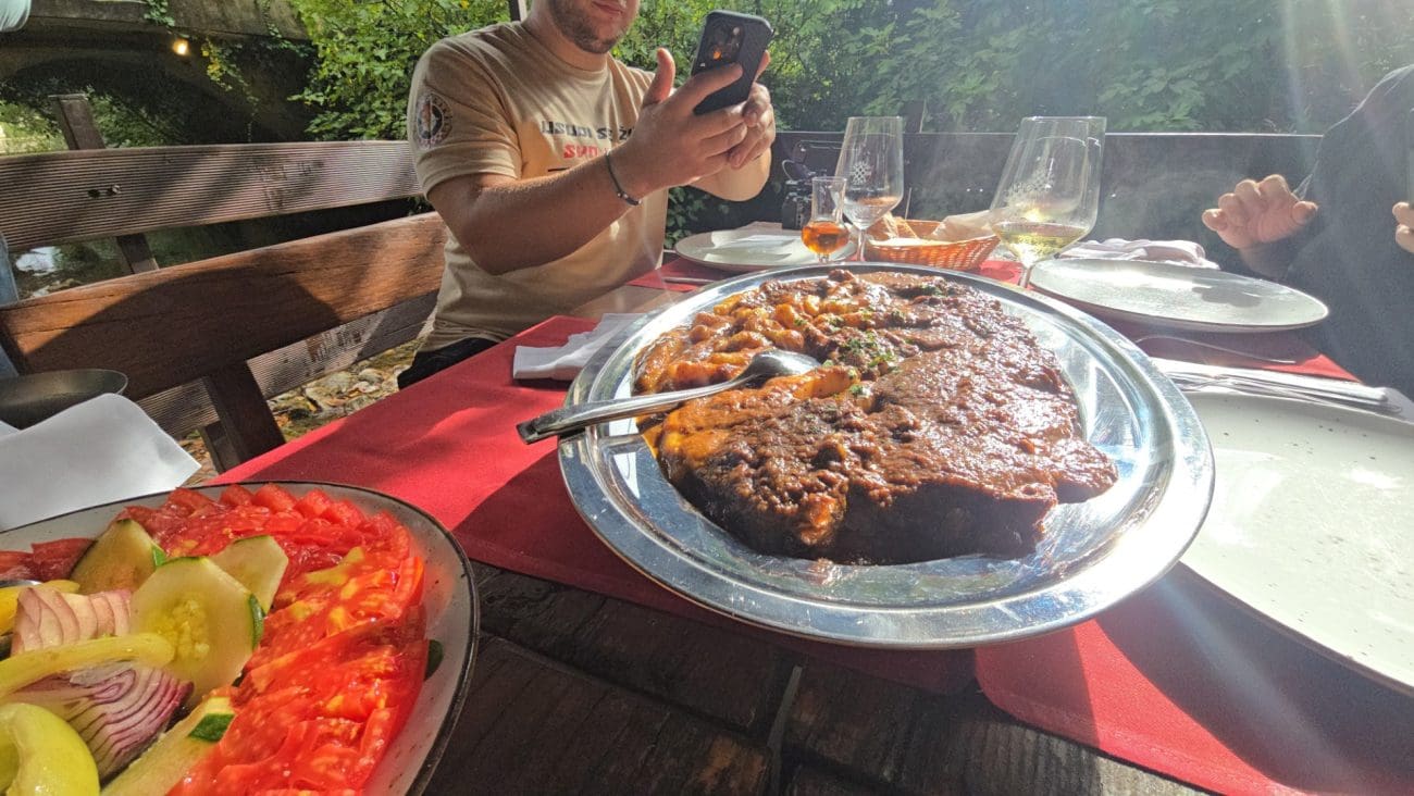 Glavno jelo bila je pašticada. Ako se sjećate janjetine u Gevgeliji, za koju smo mislili da je nemoguće svrgnuti s trona gastro-dojmova ovog putovanja, dogodilo se „nemoguće“. Konavoska pašticada od govedine oduševila nas je do te mjere da su redom uslijedile ocjene da se radi o najboljem jelu cijelog putovanja. Pečena koljenica za kraj samo je učvrstila najviše moguće ocjene konobe.