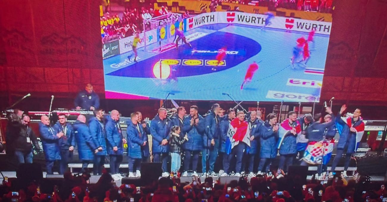 Popularna pjesma Miše Kovača "Poljubi zemlju po kojoj hodaš" bila je najava za trenutak kada se su se rukometaši počeli uspinjati na pozornicu. Voditelji su prvo najavili ljude iz stručnog stožera, njihov izlazak popratile su ovacije i pljesak publike. Svi su na pozornici i pjevaju sa publikom!