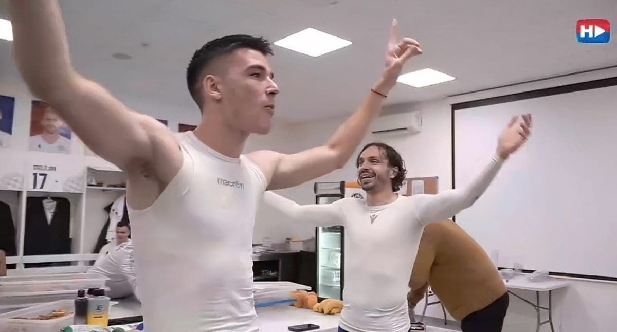 Nakon jučerašnje uvjerljive pobjede Hajduka nad Goricom kojom je nakon dugo vremena osigurao mjesto jesenskog prvaka, igrači Hajduka, treneri, direktori,.. su se zadovoljni okupili u svlačionici i zapjevali.