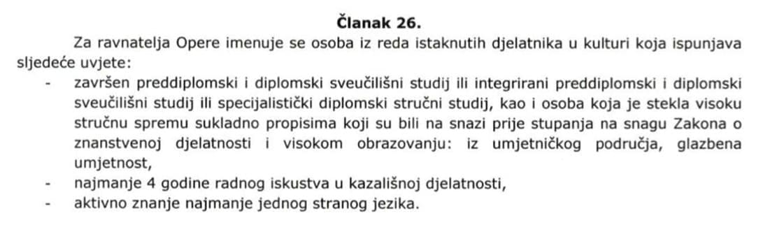 Što se tiče formalnih kvalifikacija novog ravnatelja Opere, propisanih Statutom HNK, preciznije člankom 26., intendant je za sada ostao prilično suzdržan.