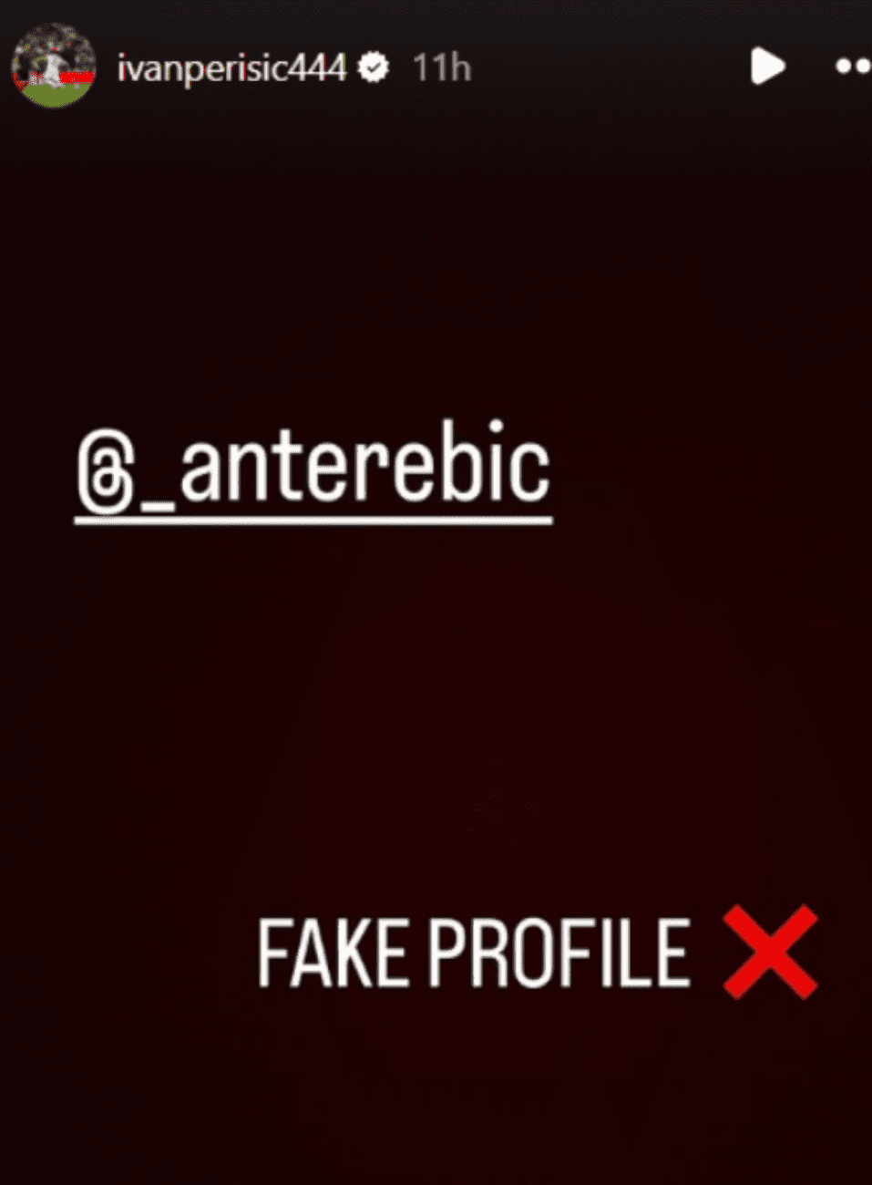 Ivan Perišić sinoć se oglasio putem Instagrama kako bi upozorio svoje pratitelje da je profil koji se predstavlja kao njegov nekadašnji suigrač iz reprezentacije Ante Rebić – lažan. Na storyju je objavio snimku spornog Instagram profila i jasno poručio: "Lažan profil."