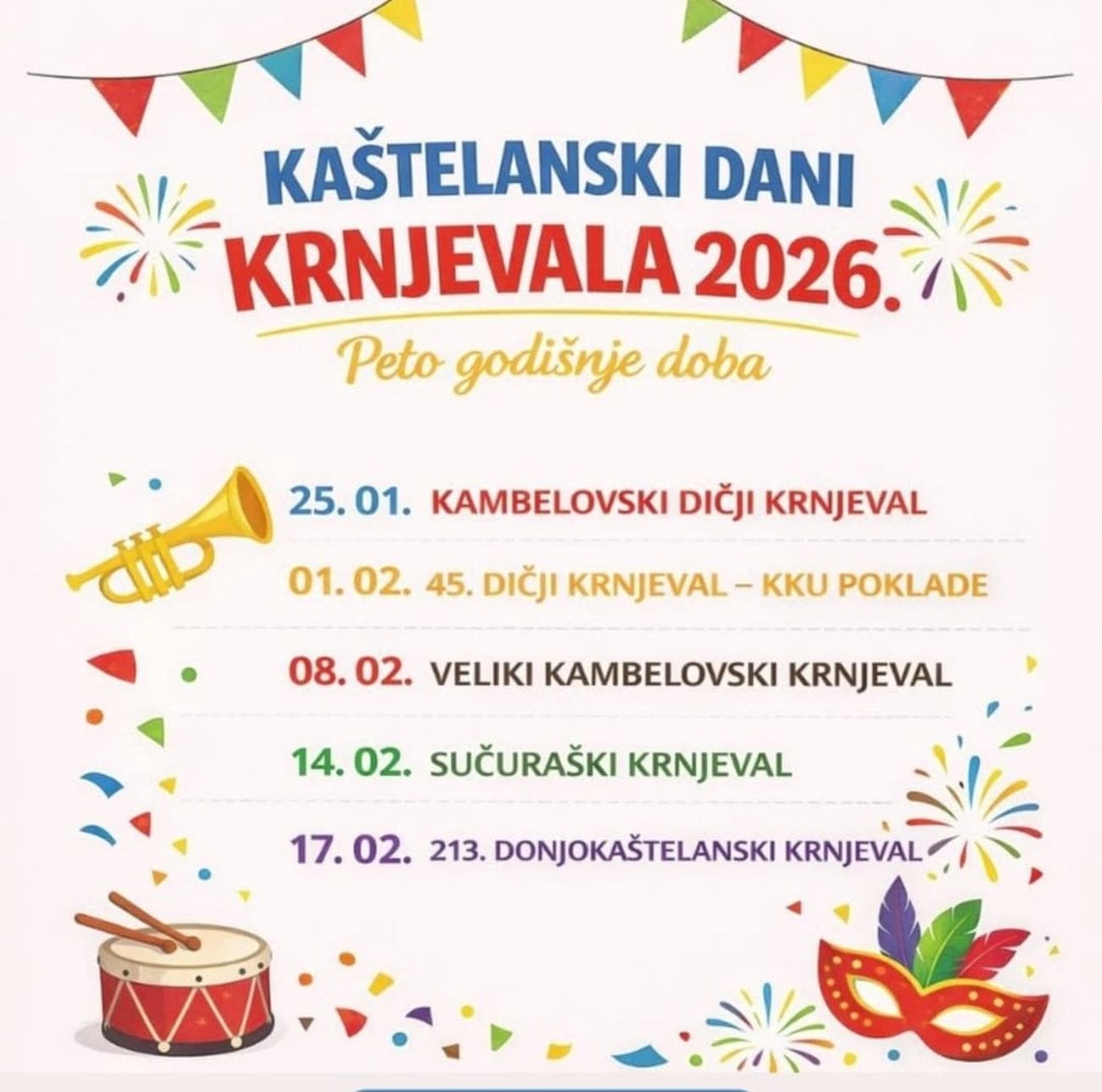 KU Polantana prva kreće sa svojim karnevalom, pa nas tako 25. siječnja očekuje 28. Dičji krnjeval, a 8. veljače je 31. Kambelovski krnjeval i 20. Županijske maškare.