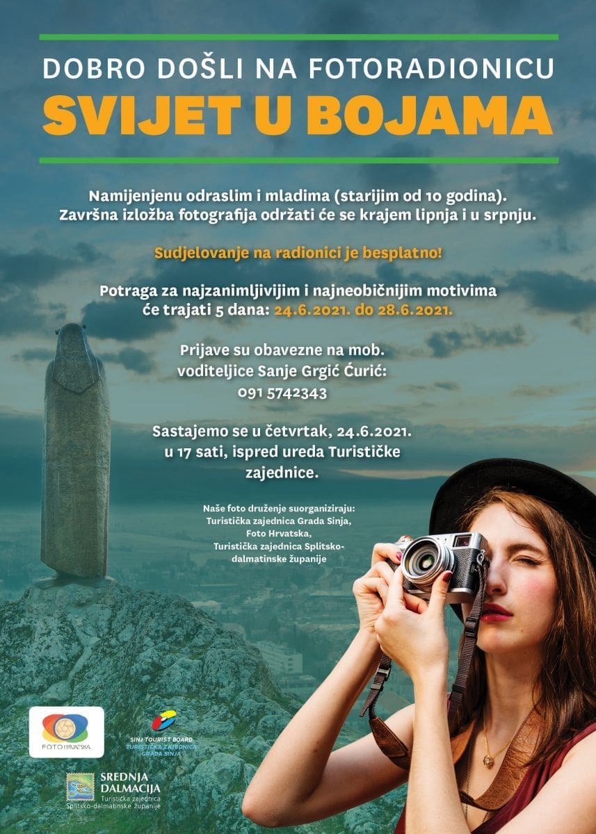 Petodnevna fotoradionica Svijet u bojama održava se po drugi put u gradu Sinju u suorganizaciji Foto Hrvatske i Turističke zajednice grada Sinja, a uz potporu Grada Sinja i Turističke zajednice Splitsko – dalmatinske županije.