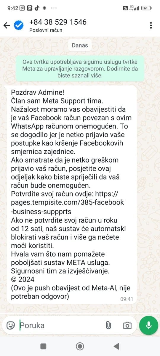 I sam Facebook, odnosno, tvrtka Meta, odbacuje da će te dobiti službeno od njih poruku tipa "učinite ovo sada ili ćemo zatvoriti vaš račun."