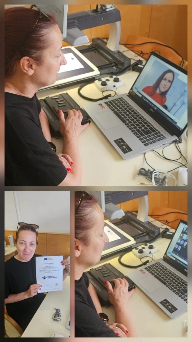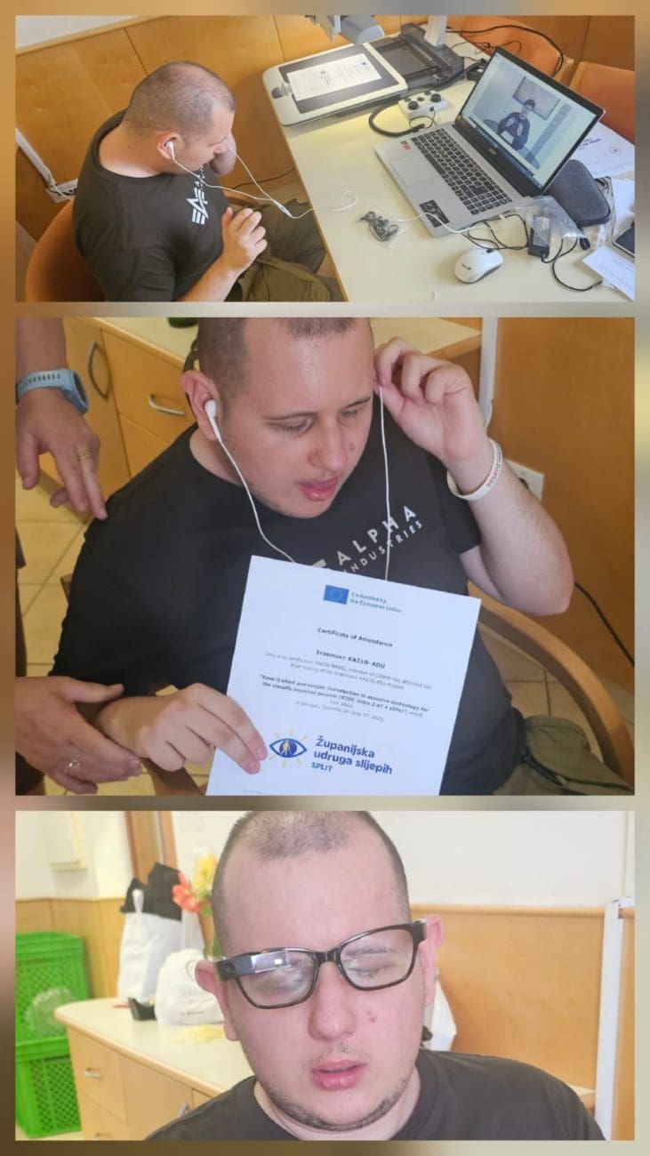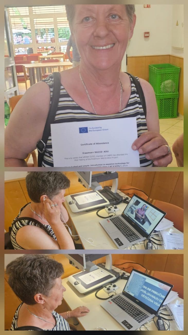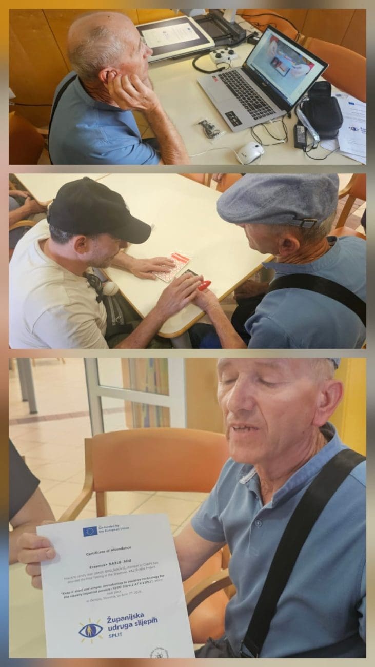 Kako bi se osigurala optimalna kvaliteta i individualizirani pristup, projektni tim Županijske udruge slijepih Split je u bliskoj suradnji sa slovenskim projektnim partnerom MDSS Kranj organizirao pilot testiranje 9 video lekcija o 9 različitih asistivnih pomagala za osobe oštećena vida iz Slovenije i Hrvatske. Zahvaljujući ovom partnerstvu, svih devet asistivnih alata bili su dostupni sudionicima iz Hrvatske i Slovenije, koji su ih pažljivo pogledali i testirali u stvarnom vremenu.