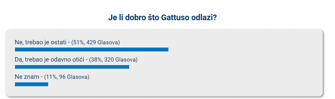 Gotova je Gattusova epizoda na Poljudu. No, izgleda da se mnogi ne slažu s odlukom da Talijan ode iz kluba. Više od 800 čitatelja Dalmacije Danas glasovalo je u anketi koju smo priredili danas, a čak 51% njih smatra da Gattuso nije trebao otići.