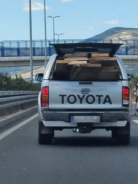 Na njima se vidi vozilo koje prenosi teren u prtljažniku i to tako da daske vire izvan automobila, a one nisu označene.