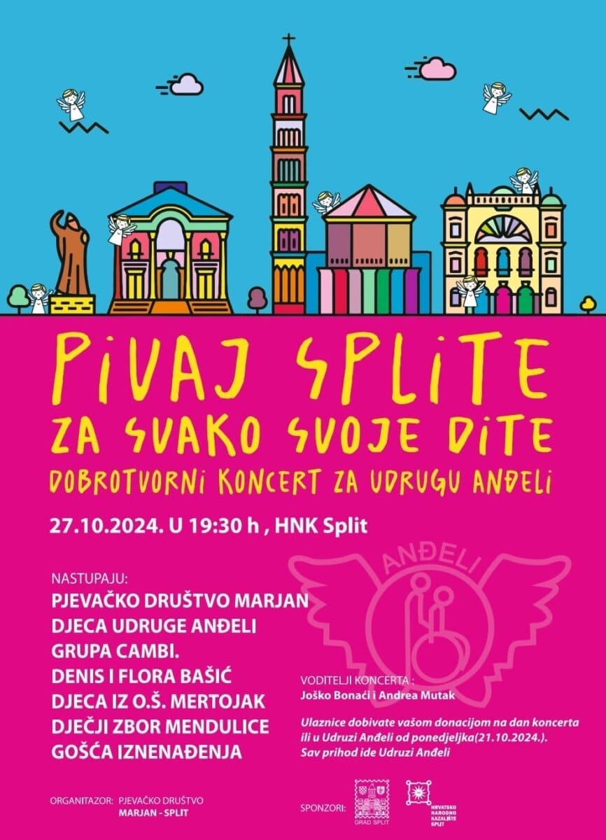 Anka Đikić iz splitske Udruge Anđeli najavila je dobrotvorni humanitarni koncert koji će se održati u nedjelju, 27. listopada, s početkom u 19 sati i 30 minuta, u Hrvatskom narodnom kazalištu. Ovaj događaj, pod nazivom "Pivaj Splite za svako svoje dite" organizira Pjevačko društvo 'Marjan', poznatije među Splićanima kao 'Marjanke'.