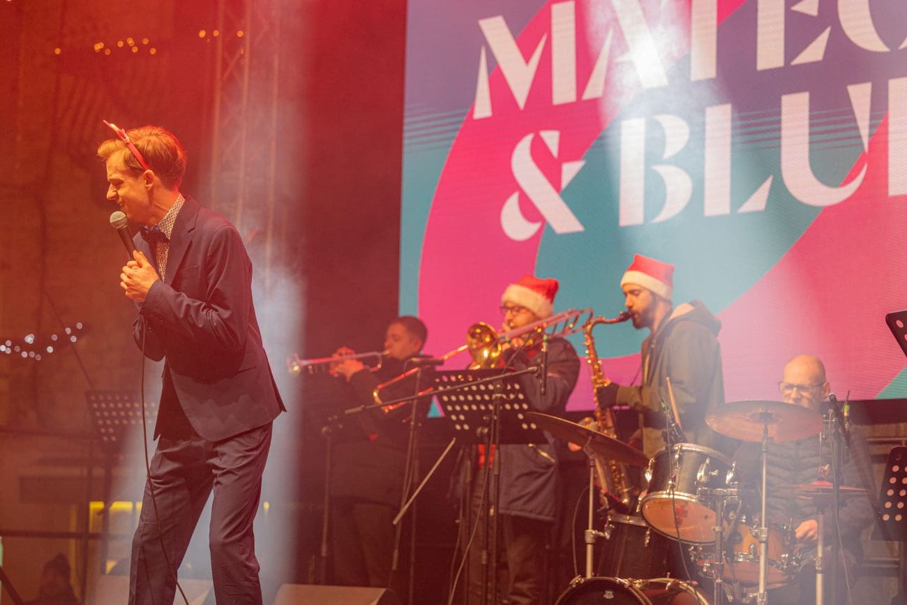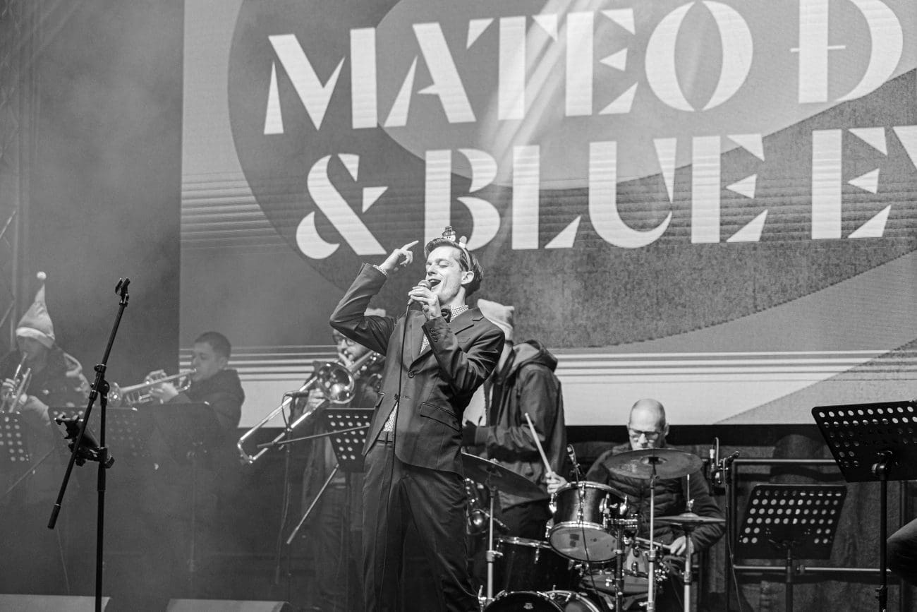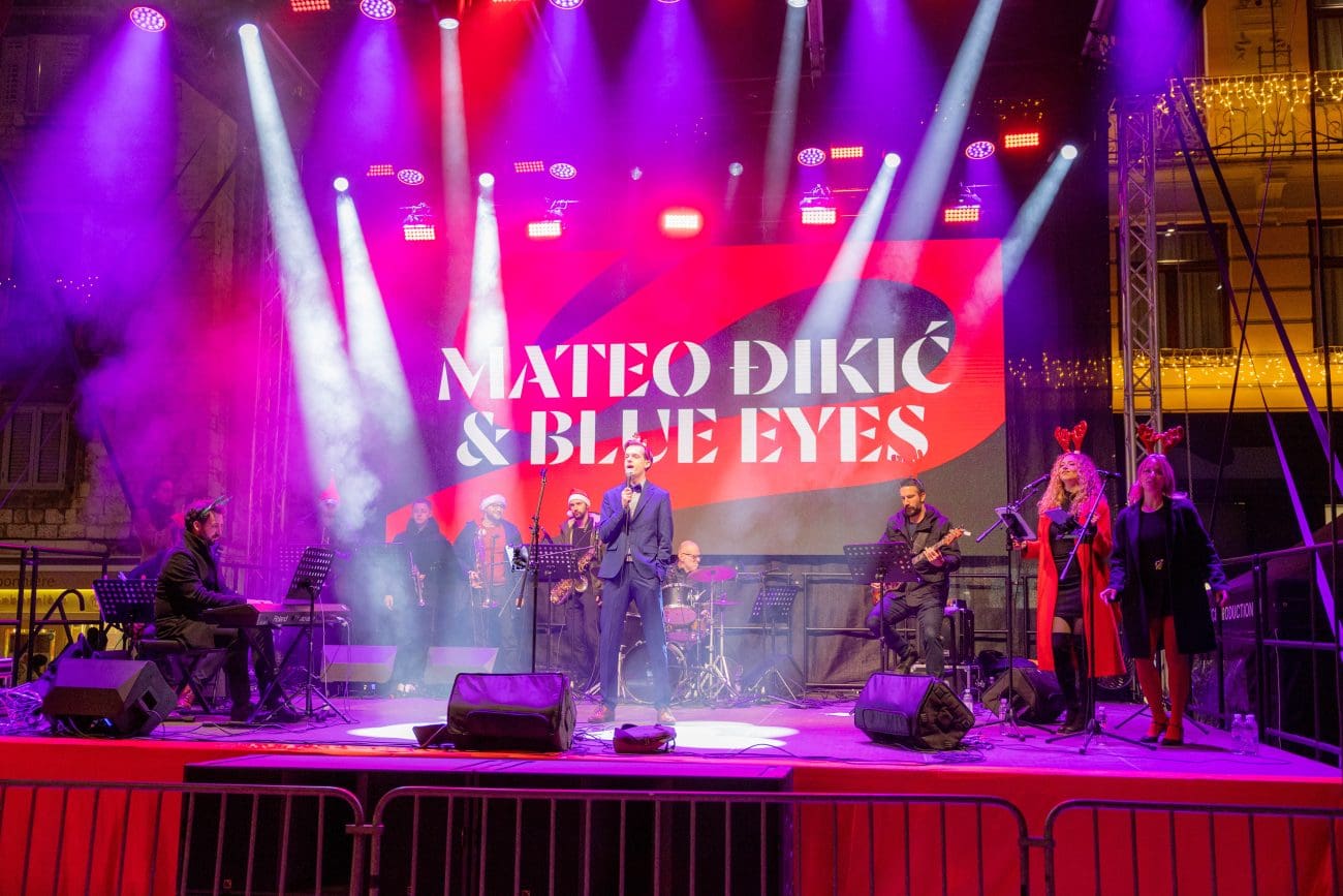 Splitska Pjaca večeras se pretvorila u filmsku kulisu u kojoj su Mateo Đikić i Blue Eyes publici donijeli jazz standarde, božićnu filmsku glazbu i bezvremenske evergreene, prizivajući atmosferu 50-ih i 60-ih godina prošlog stoljeća. Uz pjesme Deana Martina, Franka Sinatre, Ive Robića i drugih glazbenih velikana, večer je protekla u znaku elegancije, nostalgije i posebnog blagdanskog ugođaja.