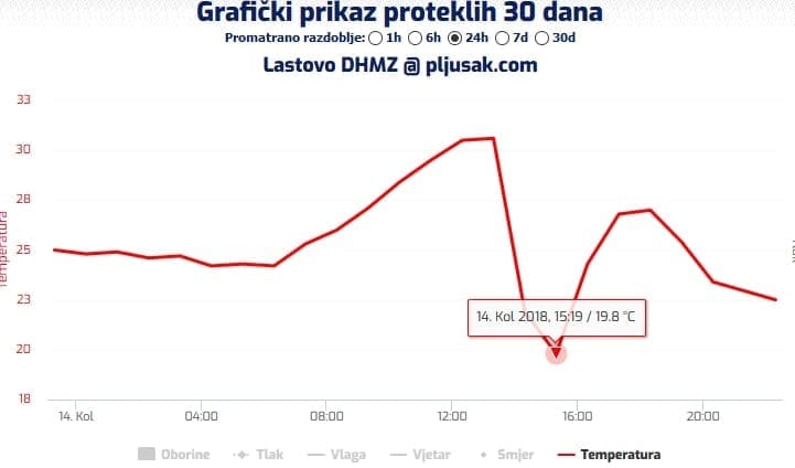 Fronta je donijela osjetno osvježenje. Primjerice, na DHMZ postaji Lastovo prije promjene je bilo 31°C, a za vrijeme nevremena temperatura je pala i ispod 20°C. Očekivano, najviše je zahladilo u planinama, na Velikoj Duvjakuši na Dinari popodne je bilo samo 10 stupnjeva.